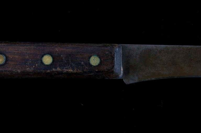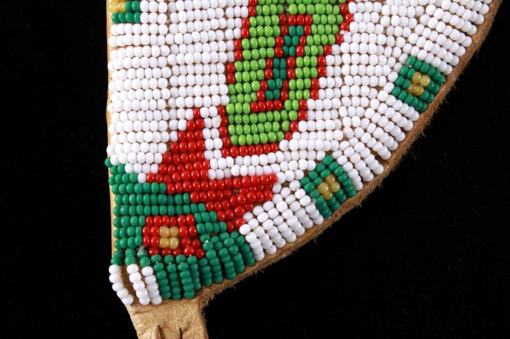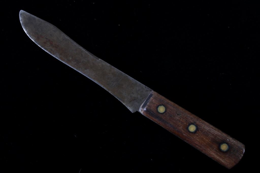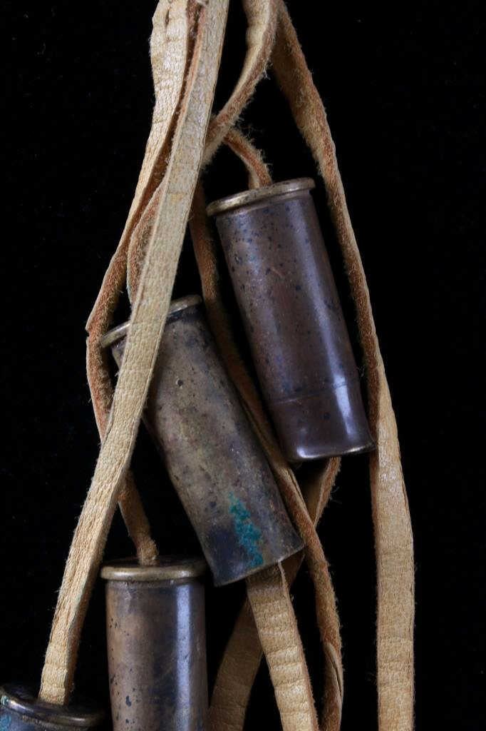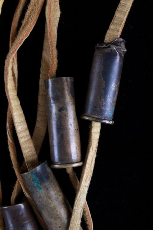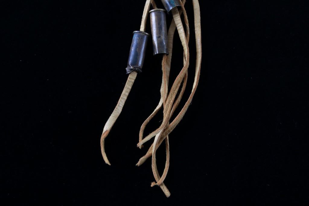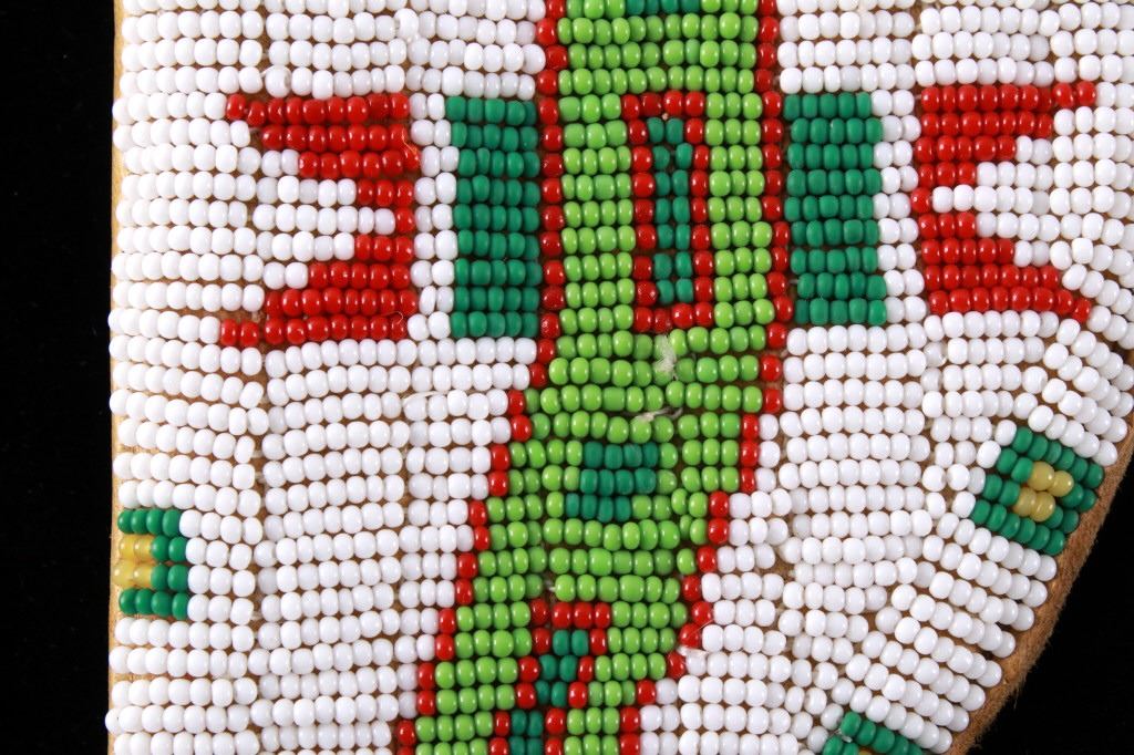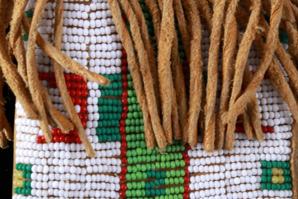 The lot features a mid-to-late 20th Century beaded sheath from the Sioux Indians paired with an old late 19th Century Indian Trade Knife. The knife features a Buffalo Skinner pattern with sharp blade having a nice dark coloring and is paired with a two piece walnut grip with copper rivets. The sheath is comprised of tanned hide leather over harness saddle leather and is covered in glass beadwork in a geometric pattern further accented by fringe along the top and bottom. The bottom fringe have four jingle cones which are comprised of brass shell casings, three W-W (Winchester Western) Winchester .38-40 cases and one W-W (Winchester Western) Super .44 Remington Magnum case. The fringes extended at the top center around to the back side. The piece was likely made for use at a ceremony, powwow or rendezvous. The sheath measures 20"L with fringes by approx. 6"W. The knife is 11 3/8"L with a 6 7/8"L blade.