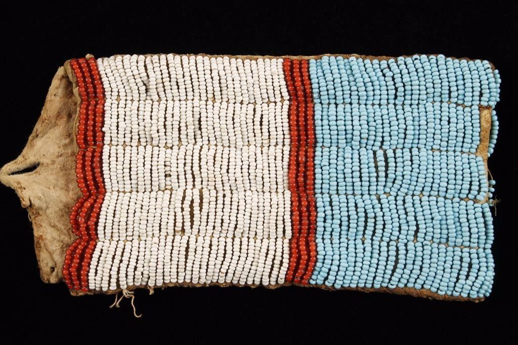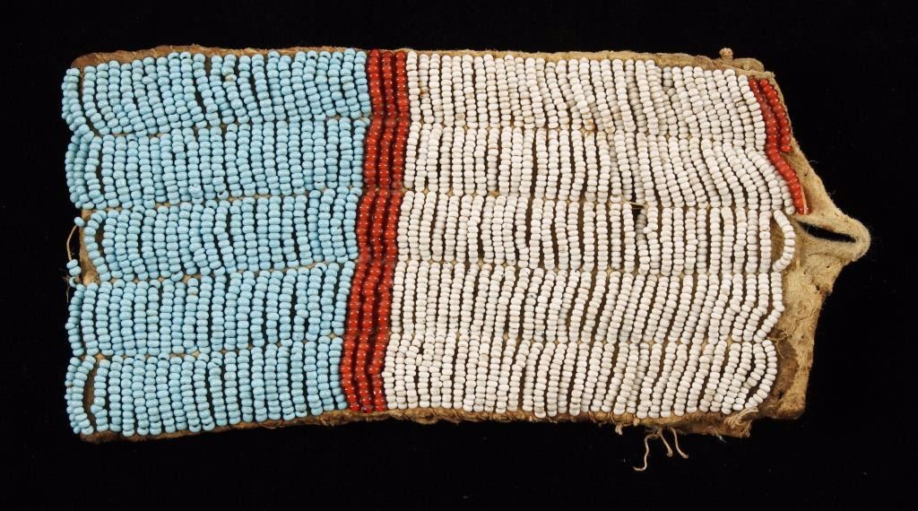 Hide beaded bad in red, white, and blue. Turn of the century, overall good condition for its age.