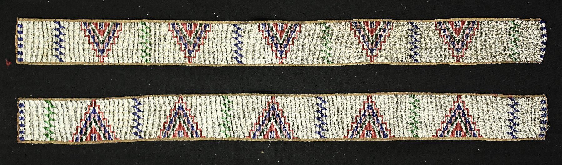 Colorful pre-1900 attractively beaded strips on brain tanned hide with dazzling colors and measuring 33".