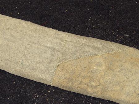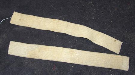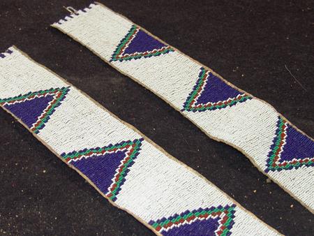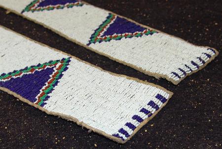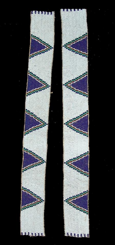 Fantastic pair of sinew sewn and lazy stitch beaded legging/warshirt strips with triangular forms on a white field - all done on buckskin backing. Condition: very good/excellent. 29" x 3" each