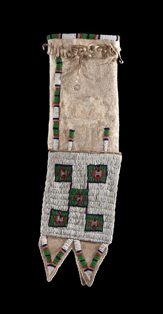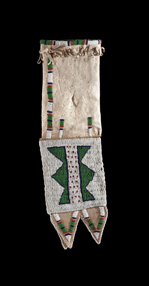 24” x 7” multicolored geometric design on native tanned hide. Lane beadwork up the side and at opening, with triangular tabs at the base. Good condition with minor restoration, c. 1910.