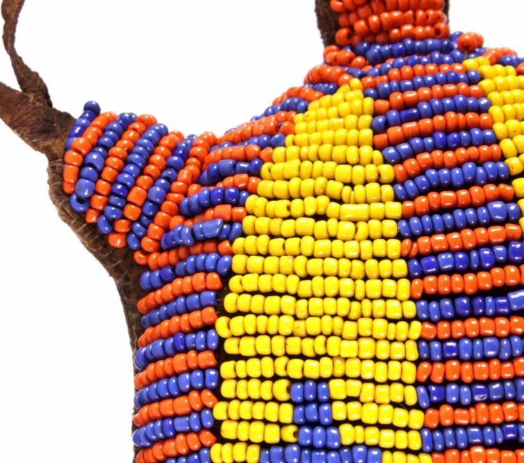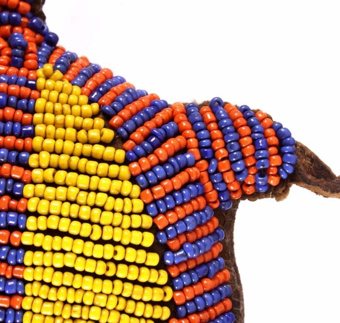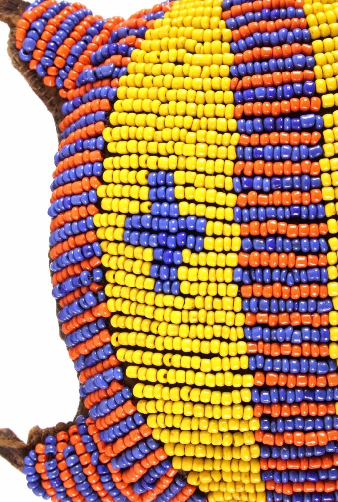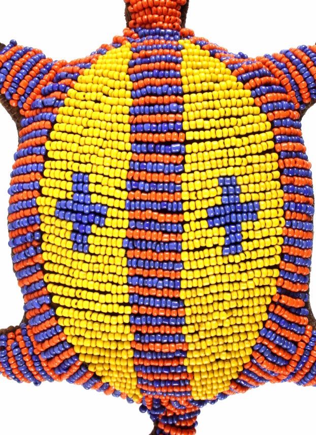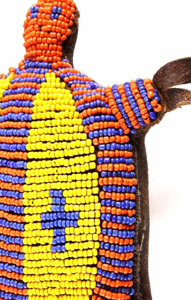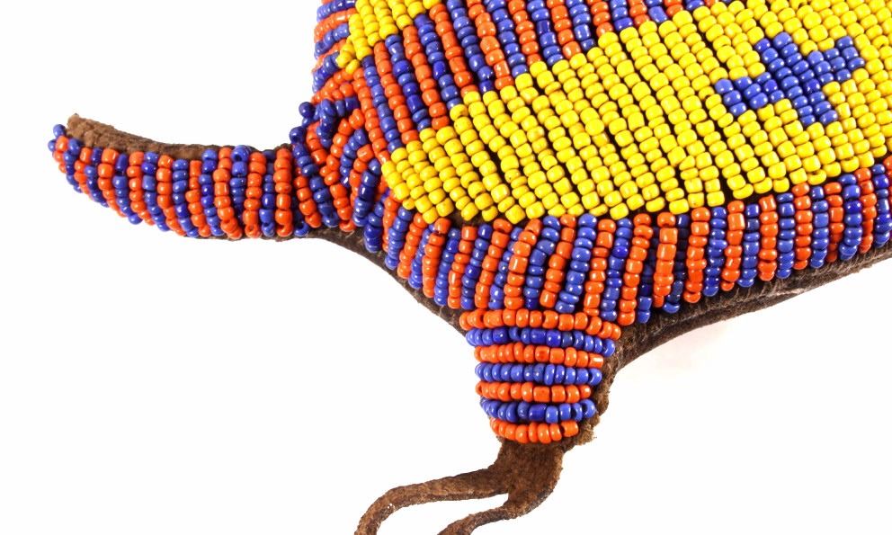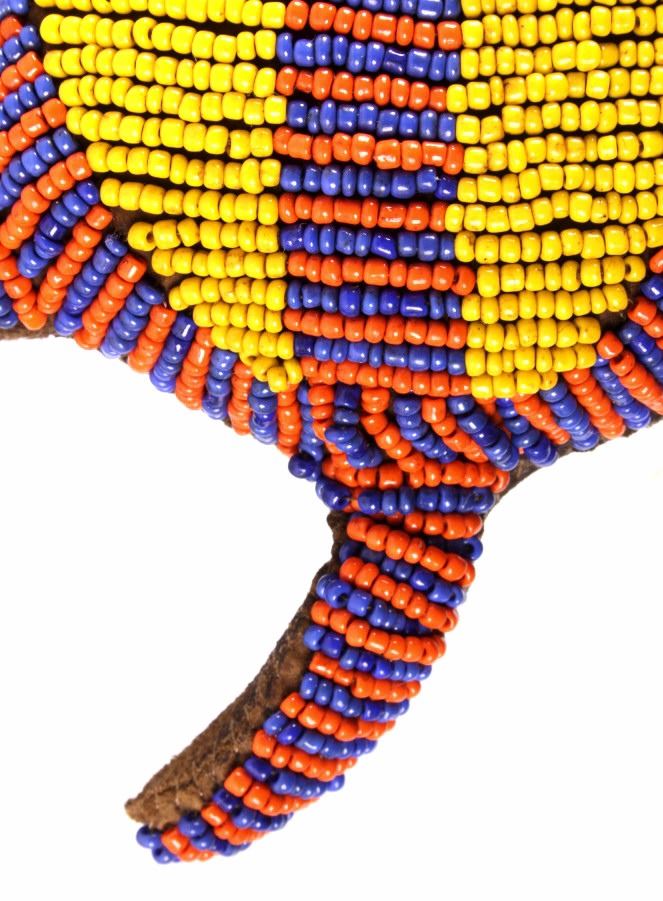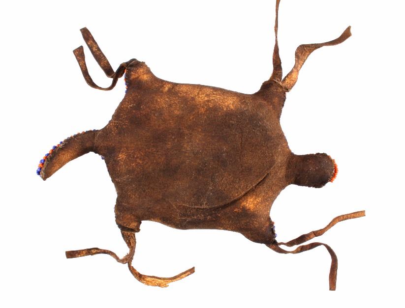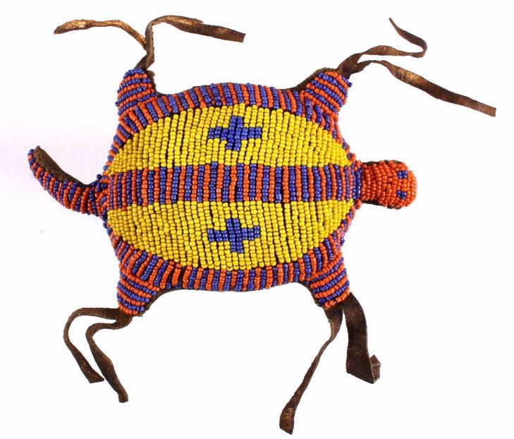 This is a Sioux beaded tortoise fetish from the early to mid 20th century. The piece is made on tanned hide and features a beautifully beaded design using seed beads such as Dark Blue, Corn Yellow and Orange. The Sioux fetish is in good condition with no visible damage or bead loss. It measures 4" x 6".