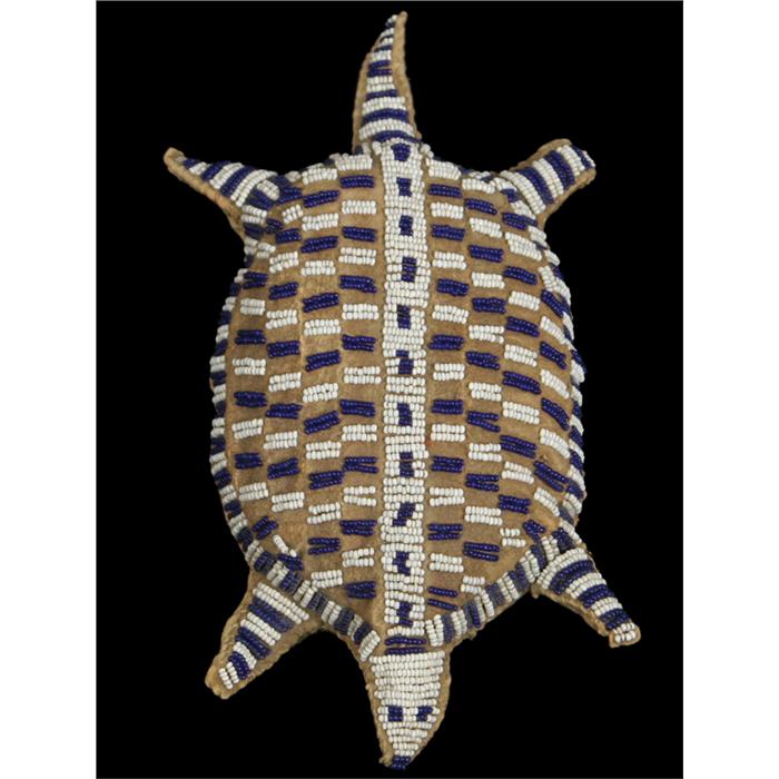Sioux Beaded Umbilical Amulet. 8" long, 4" wide. Checkerboard design. C. 1890. Excellent condition. (est $1,000-2,000)