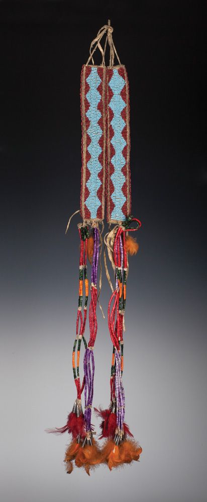 Sioux Beaded and Quilled Armbands. Sioux men's armbands with bright multicolored quill wrapped drops. 26" overall with 9 1/2" panels beaded in light blue and deep red, in half diamond design. Tin cone and feather decorations. Circa 1900.