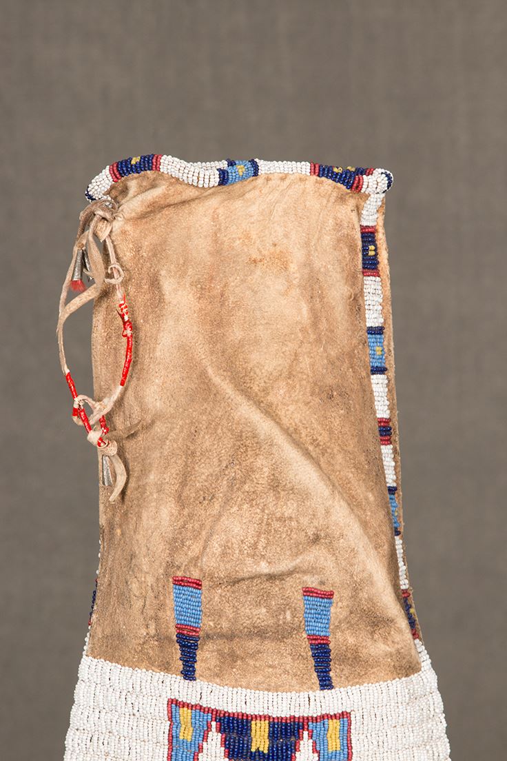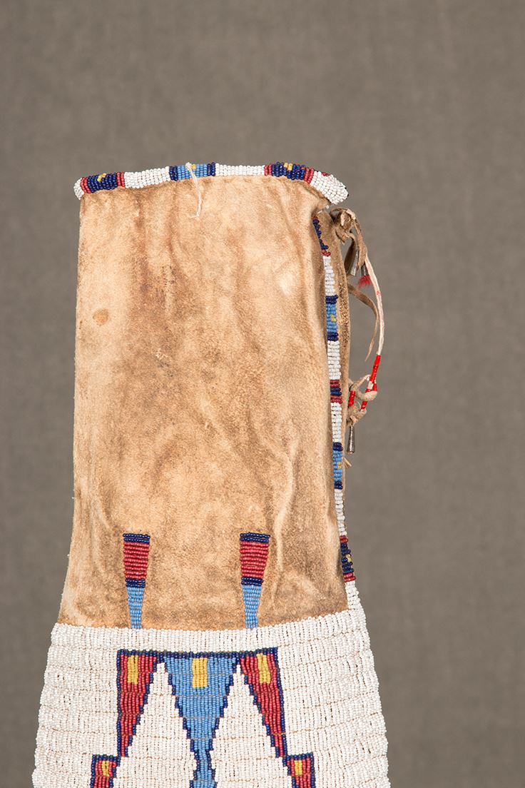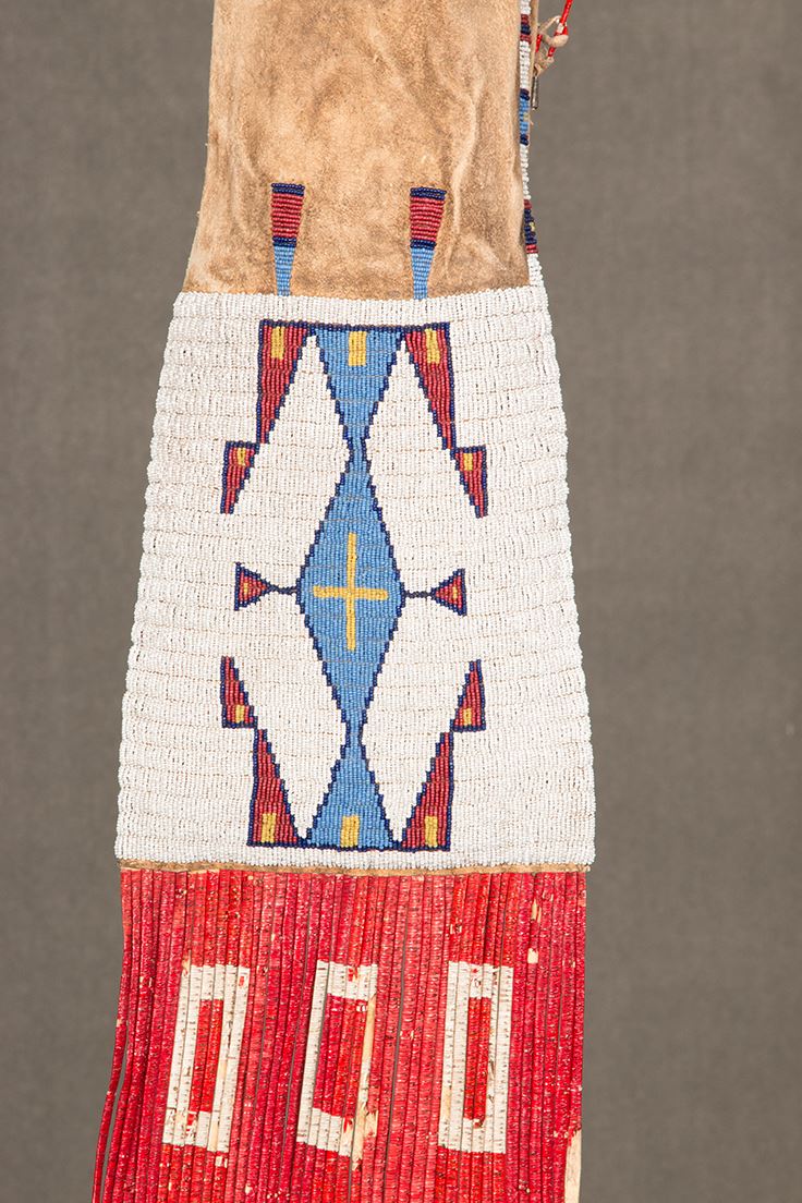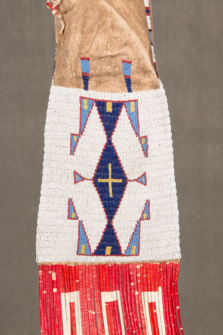 Sioux Beaded and Quilled Man's Pipebag. 38" long including 6" of quillwork and 12" of fringe. 8" wide. Finely beaded, geometric designs with colors of white-heart red, light blue, and yellow on a white background. Beaded on buffalo hide and sinew sewn. Includes pipe tamper. Circa 1890. Provenance: Collector's Notes