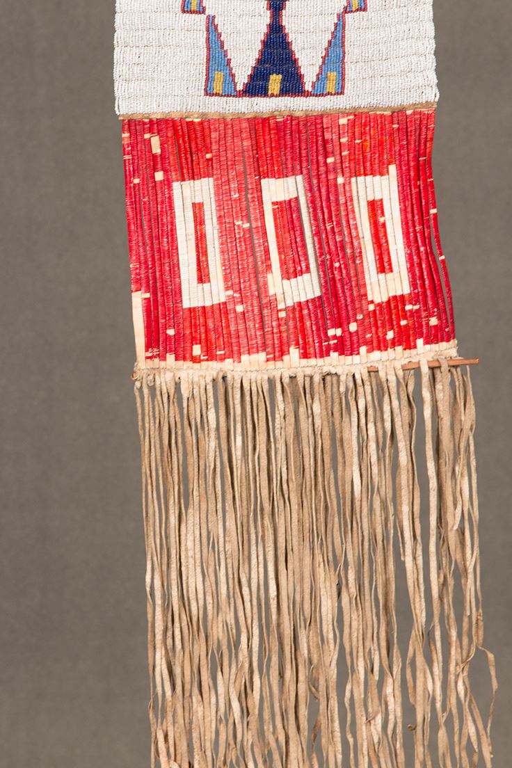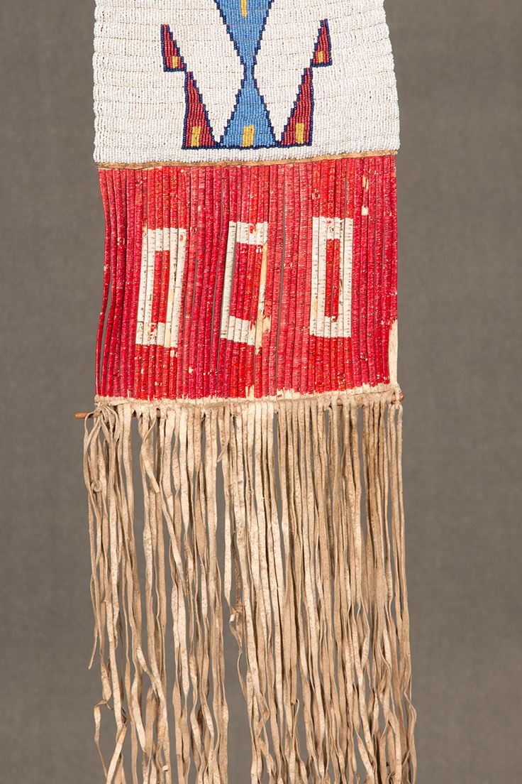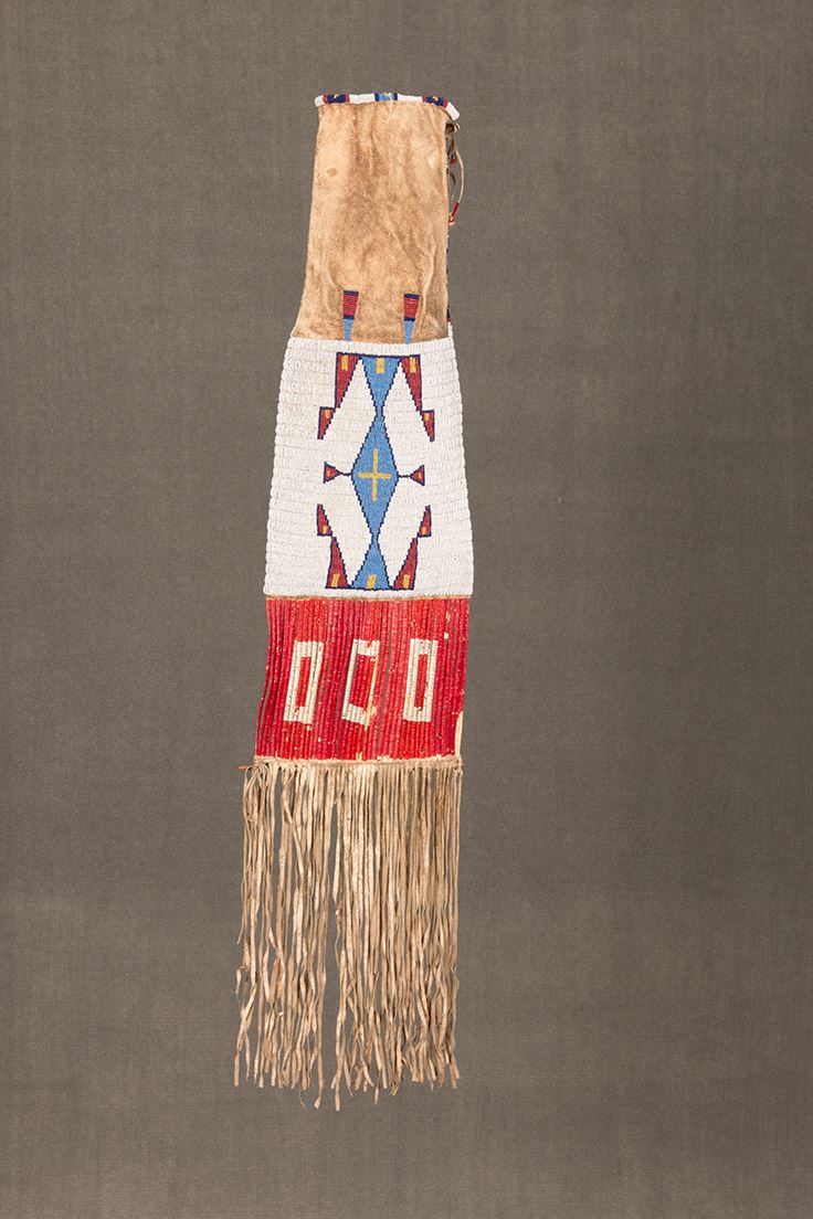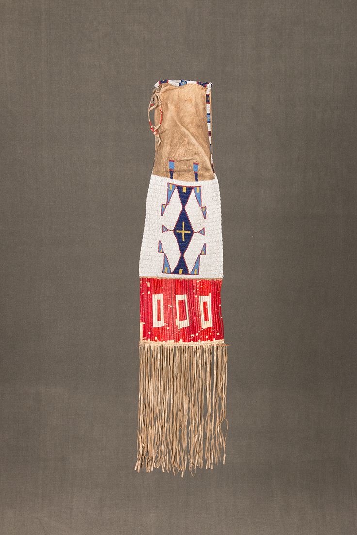 Sioux Beaded and Quilled Man's Pipebag. 38" long including 6" of quillwork and 12" of fringe. 8" wide. Finely beaded, geometric designs with colors of white-heart red, light blue, and yellow on a white background. Beaded on buffalo hide and sinew sewn. Includes pipe tamper. Circa 1890. Provenance: Collector's Notes