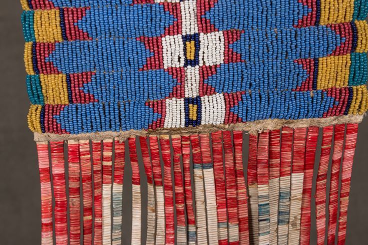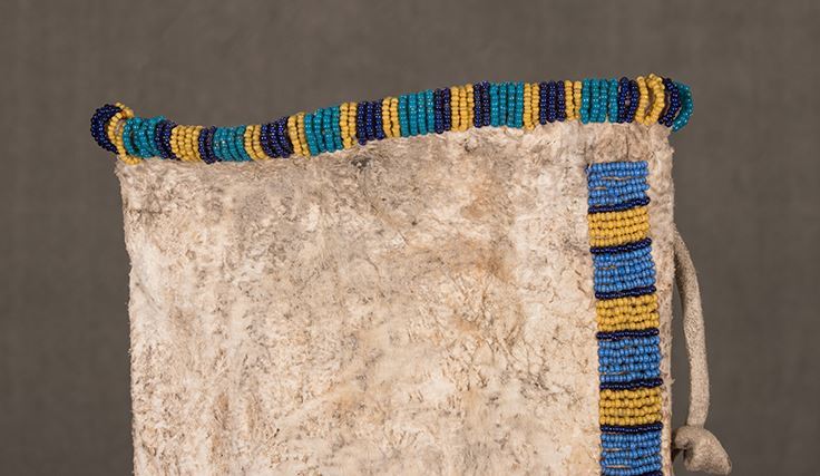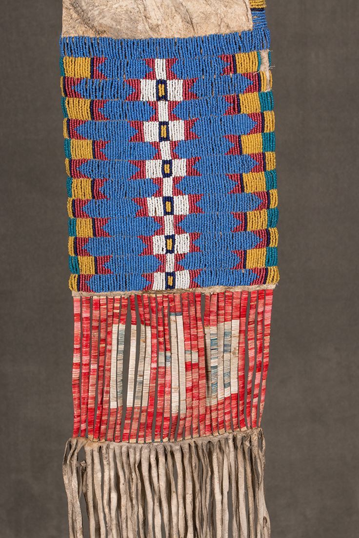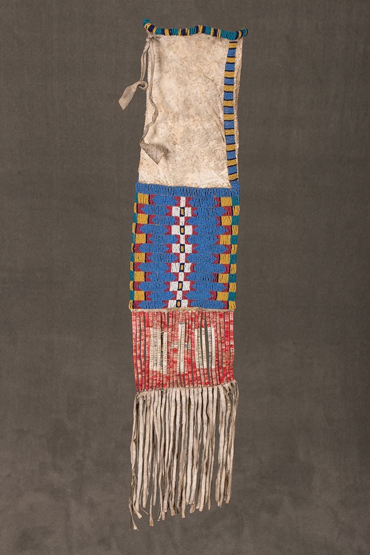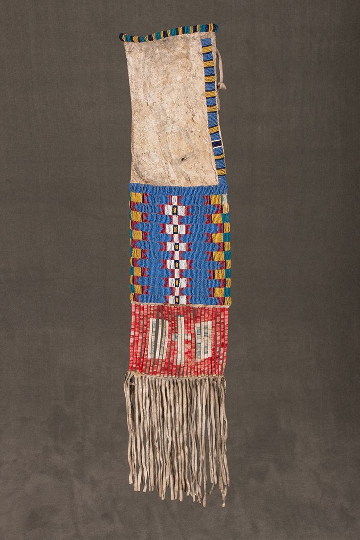 Sioux Beaded and Quilled Pipe Bag. 18" long with 5 ½" of quillwork and 10" of fringe. All blue background with nice geometric designs. 19th century.