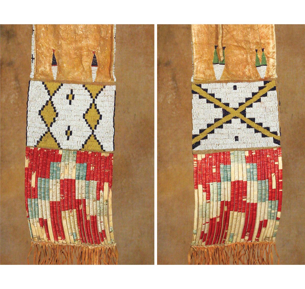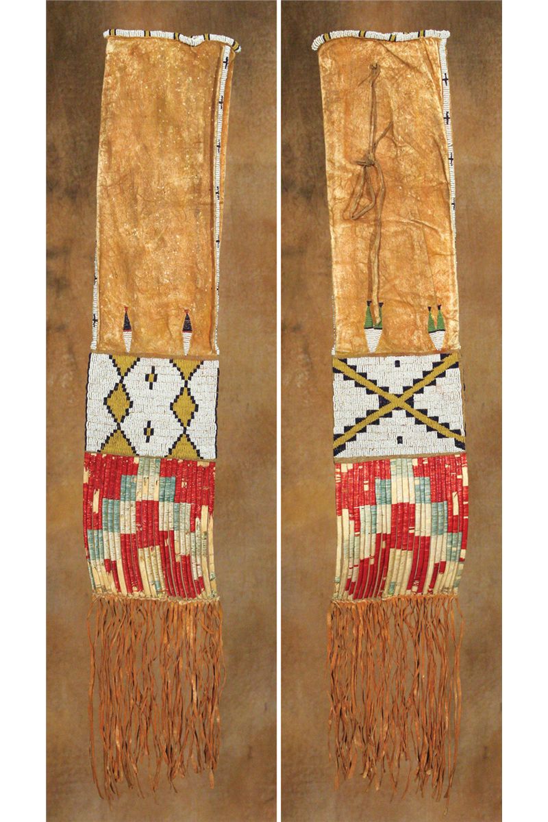 Sioux Pipebag. 20" long x 6" wide. Beaded designs differ from side to side. Red ochred hide on body and fringe. 6.5" of dyed quill-wrapped slats are attached to the bottom, terminating in 8" of fringe. 19th century.