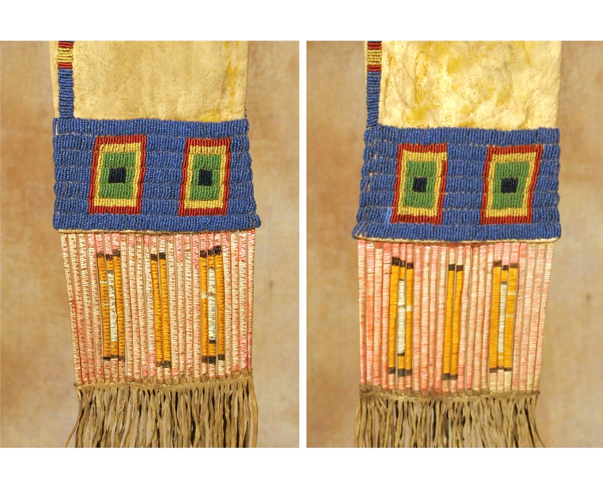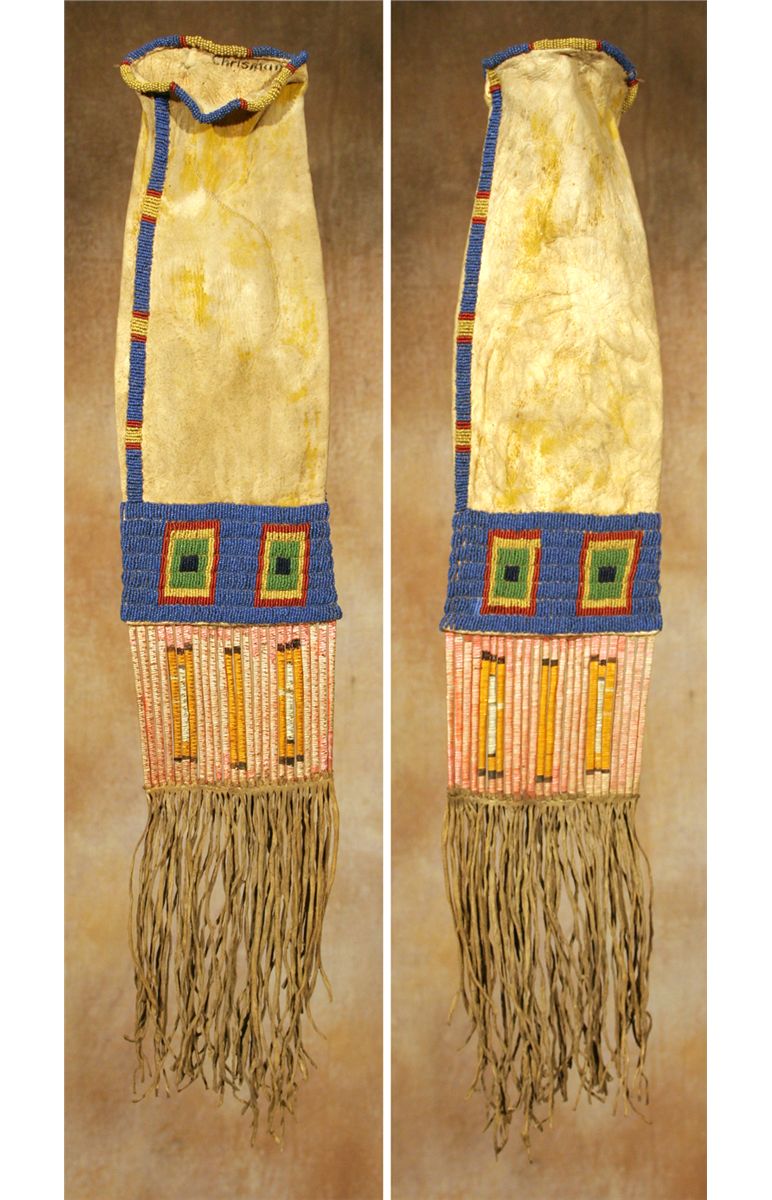 Sioux Pipebag. 16" with 4.5" of quillwork and of 9" fringe. Some yellow ochre still visible. Finely beaded. Circa 1870.