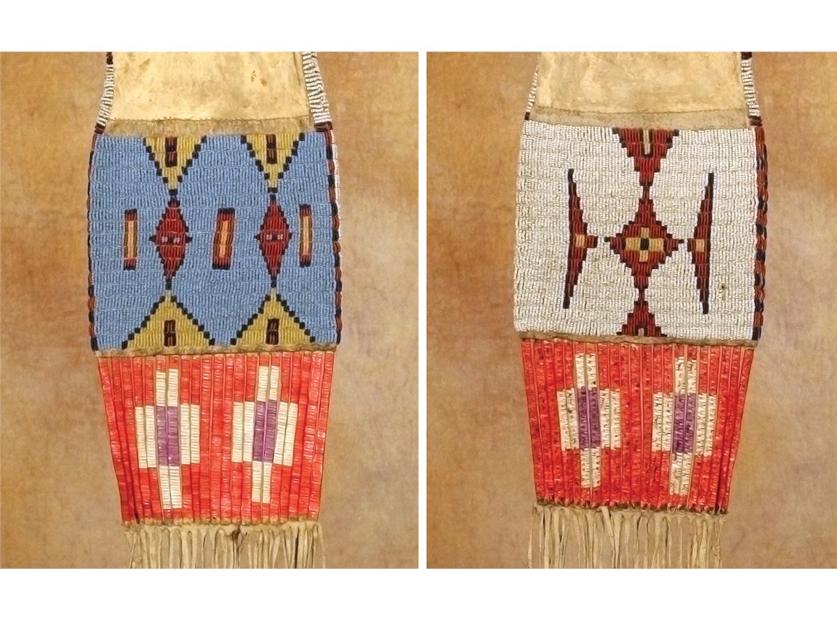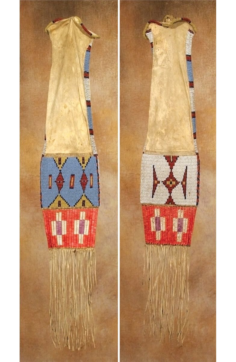 Sioux Pipebag. 22" x 7" bag, beaded in pale blue, yellow, cobalt, white-heart red and white colors. Vastly different design work on each side. Lanes of beadwork continue up each edge and around the opening. 4.5" of red, purple and white quill-wrapped slats are attached to the bottom, terminating in 12" of fringe. 19th century. Provenance: Collection of Dr. Delwin and Karen Bokelman, PA.