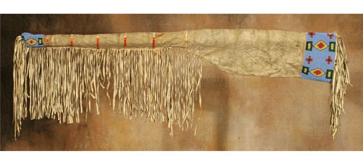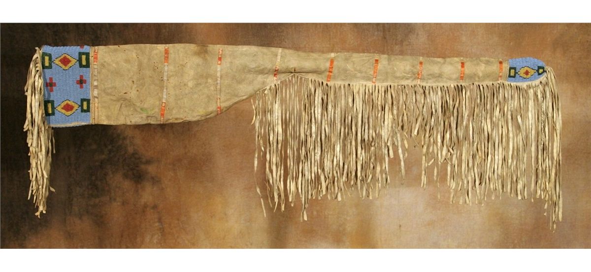 Sioux Rifle Scabbard. 42" long. Beaded on both ends in colors of greasy yellow, white-heart red, translucent green and translucent blue on a pale blue background. Bands of dyed quillwork decorate the center. Long hide fringe hangs from the lower seam. 19th century. Provenance: Collection of Dr. Delwin and Karen Bokelman, PA.