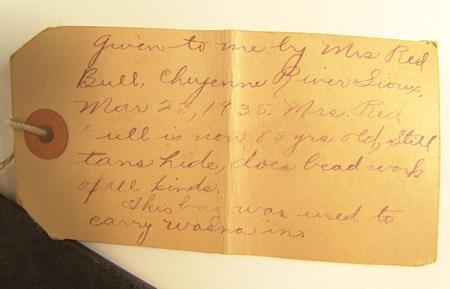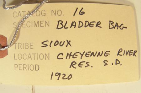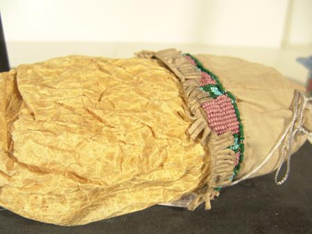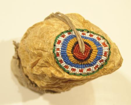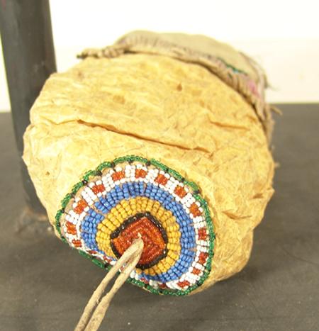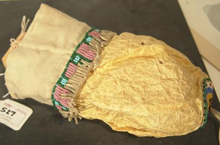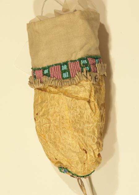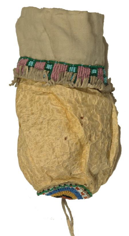 Rare Wasna bag made from a buffalo bladder with cloth and beaded top. Ex: Red Bull Family. Pre 1935. Purchased at AIA Auction in 1979 for $57.75 (lot #16); appraisal value $650. Approximately 9" high x 5" diameter