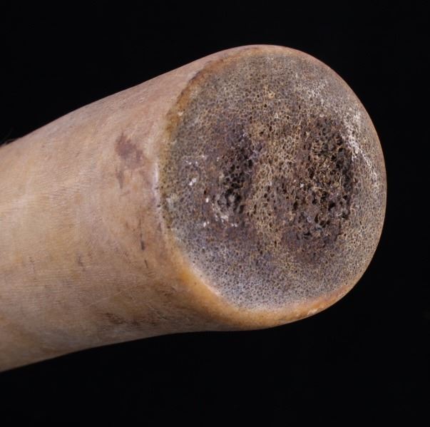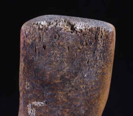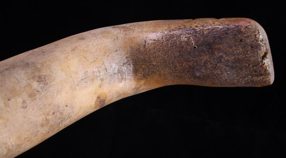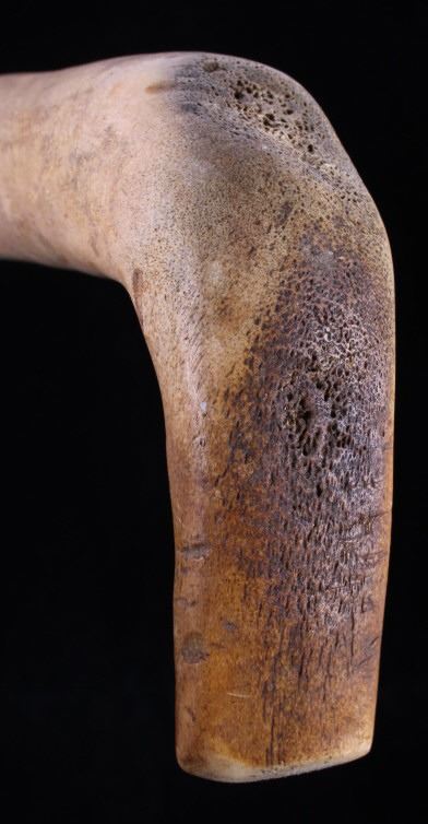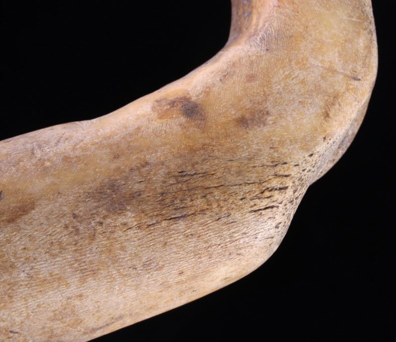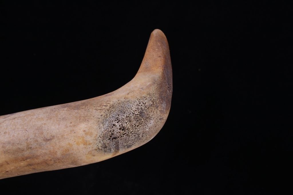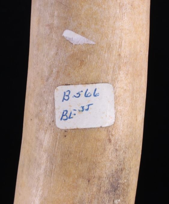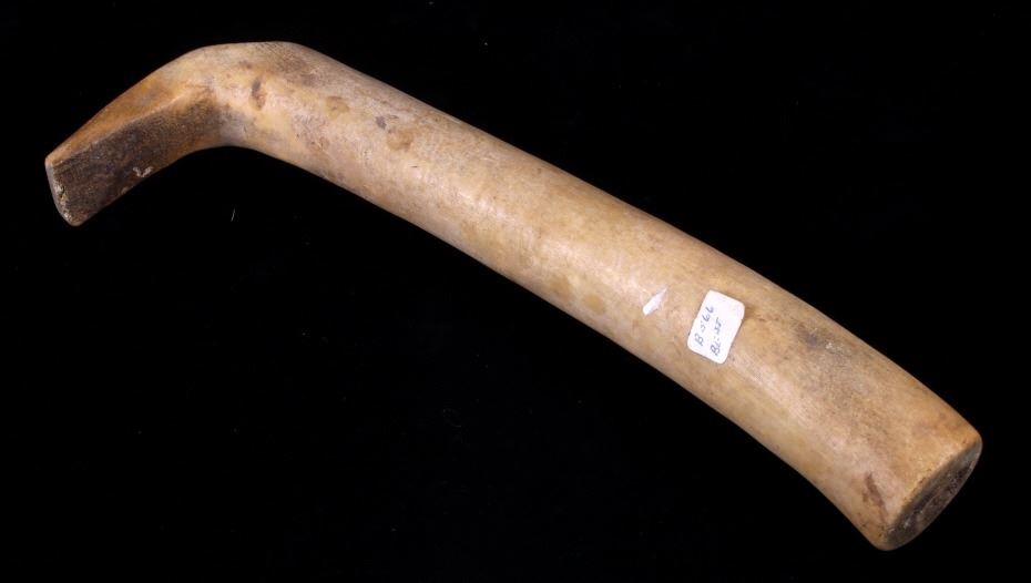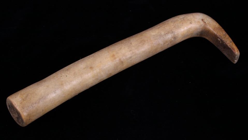 This is a fine traditional hand carved and shaped bone hide scrapper from the Northern Plains Sioux Native American Indians that dated to circa 19th Century. The piece is constructed from a Great American Bison Buffalo large bone that has been carved and shaped. The piece shows a rich heavy patina with primitive carving techniques adding to its very early Indian wars era age. The piece shows the typical drastic right turn top which would have originally held a gun barrel or bit of old iron blade adhered to the end with parfleche rawhide wrappings, which is now missing. This is truly one of the earliest museum quality adze hide scrappers of such a large size that we have had the pleasure of making available for sale. The scrapper measures 14.25" long, 4.25" wide at the head, and 2" thick at the base of the handle. The piece shows an old museum collection tag with identification numbers. Provenance: From a large Great Falls, Montana Old West and American Indian collection.
