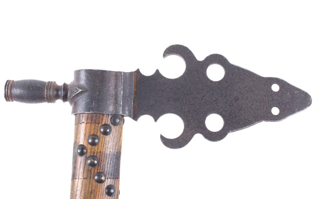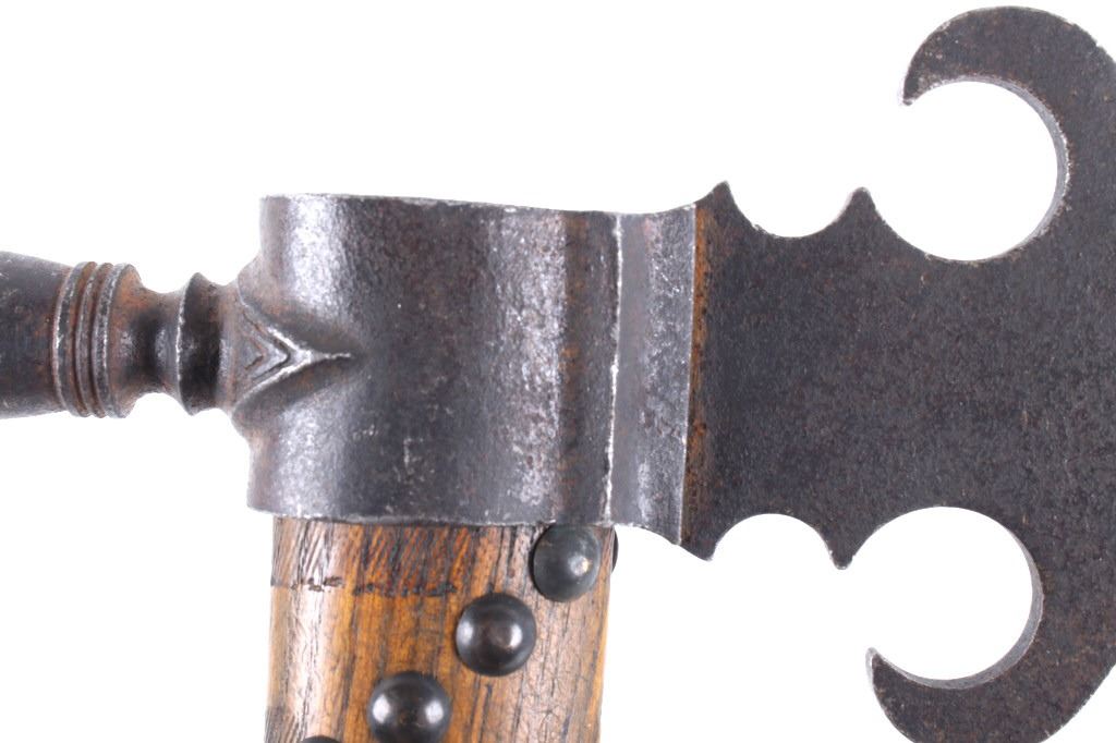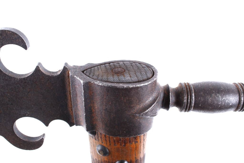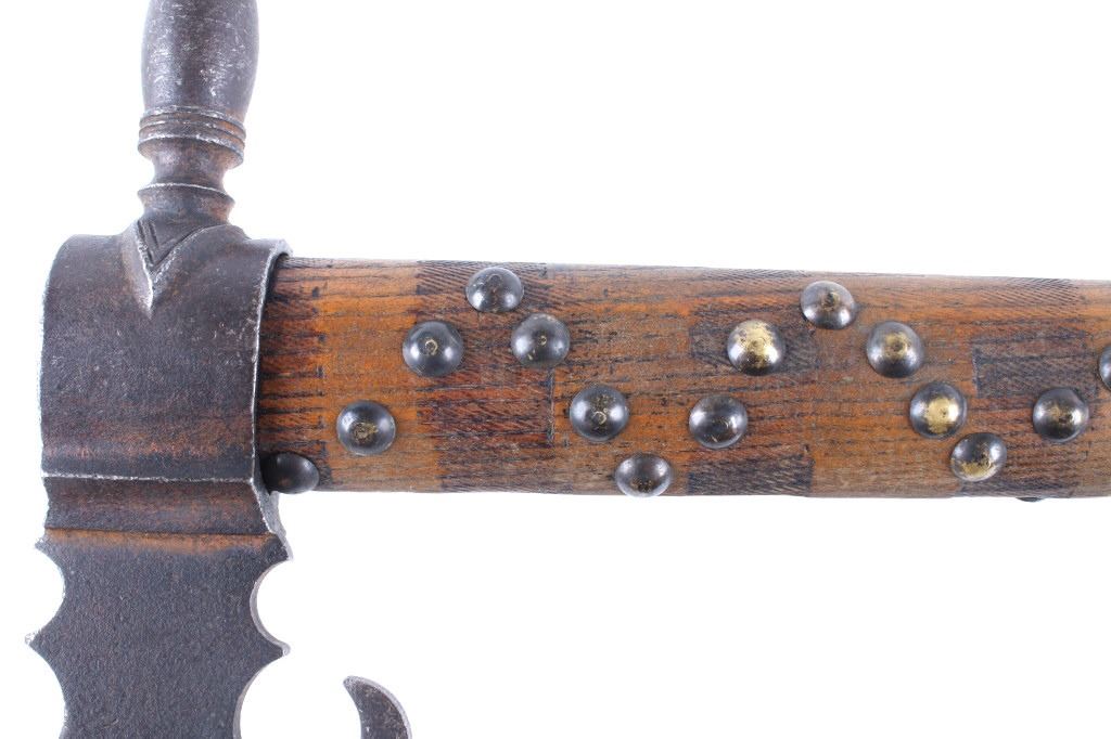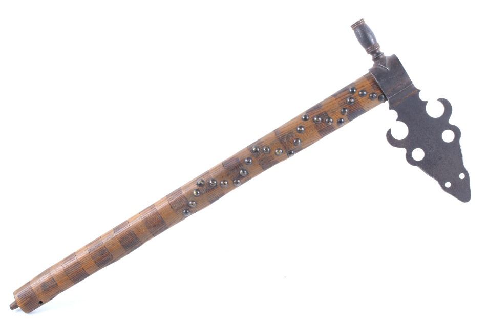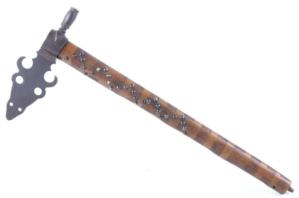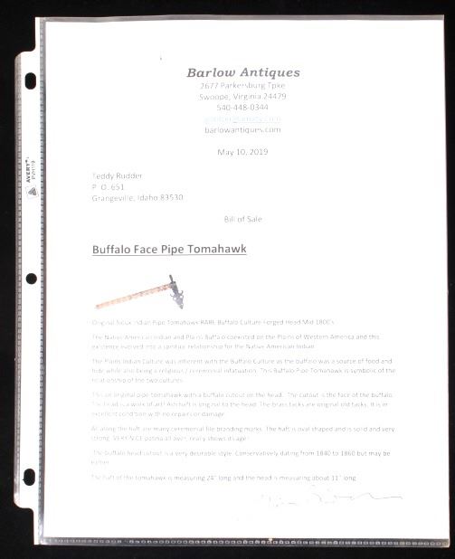Offered for public sale is this unusual unique spontoon pipe tomahawk with Buffalo-head blade from the Sioux Native American Indians dating to the 19th Century. The piece comes with a signed letter from Barlow Antiques attributing the piece to circa 1840 to 1860 Sioux. The piece shows an iron spontoon blade which has been cut in the shape of a Great American Bison Buffalo head with pierced round cutouts for eyes and smaller cutouts for nostrils. The spontoons basal processes, which are upturned, represent the Buffalo Horns. The eyelet hole is tear drop shaped, typical of mid to late 19th Century examples and shows step moldings with filed chevron leading to the elongated thin and tall bowl with molded and filed lines on the beveled bowl; the inside of the bowl is smooth. For a very similar example see Harold L. Peterson 1965 book “American Indian Tomahawks” on page 136 figure / photograph 284 attributed to circa 1880-1900 Assiniboine Indian with Buffalo Head blade. Also see “Indian Tomahawks & Frontiersmen Belt Axes” by Hartzler and Knowles for another Buffalo Head tomahawk. This example is nearly identical to the example found to be authentic original shape and piece by the experts at Cowan’s Auction sold in their April 2013 sale from the Chandler-Pohrt Collection attributed as a Buffalo Head Pipe Tomahawk from the 19th Century. The Cowan’s piece has the identical Buffalo head. The head is secured to an ash wood haft handle with extensive hot file burned bands and a zig-zag brass trade tack pattern down two-thirds of the surface on both sides. The gripping area tapers gradually towards the smoking tip, a features also seen on many mid to late 19th Century tomahawk hafts. Just below the gripping area is a pierced hole which would have held an Indian hide wrist throng, beaded drop of hide or drop of feathers, none of which is present anymore. The smoking tip is in typical tapering form and is accented by hot file burns at the end of the haft just above the tip. The brass tacks have a dark to mellow coloring and the wood has a nice mellow coloring. The head has a dark coloring, similar to the Cowan’s piece. Provenance: From a historic Eastern Montana American Indian Collection, where the piece was found to be an authentic original, one of the finest collections of American Indian weaponry and antiquities in Montana. The piece measure 25.25”L with a head that is 10 7/8”L by 3.75”W by 1.75” thick.