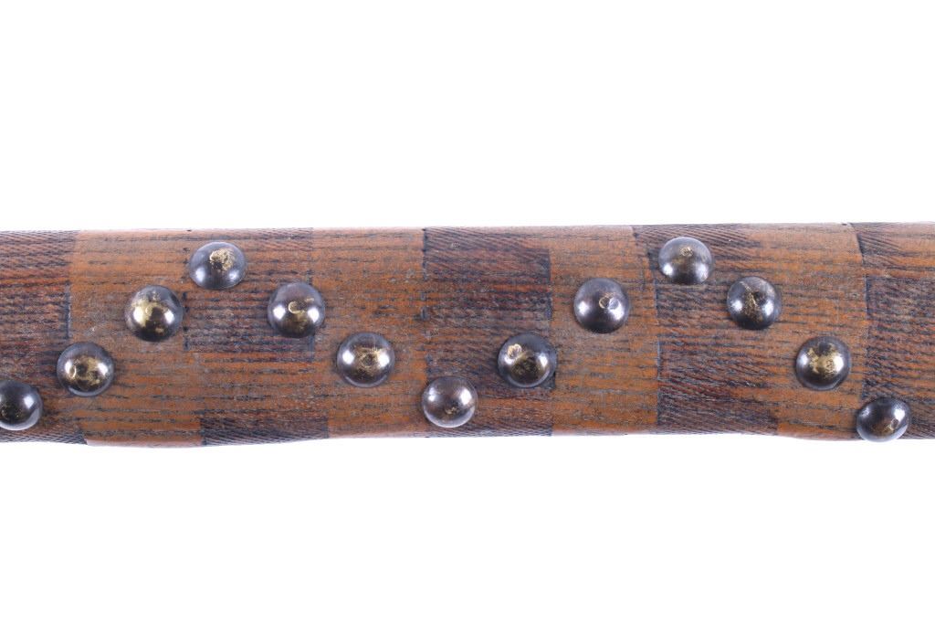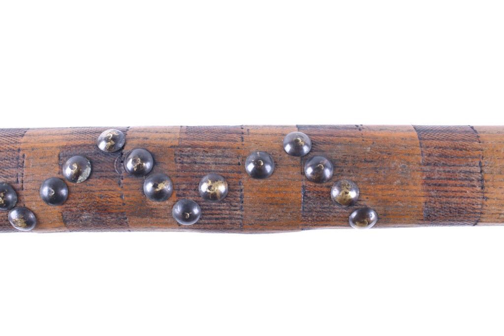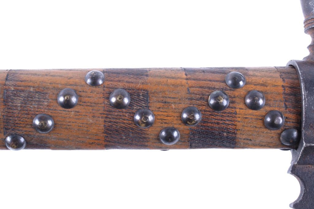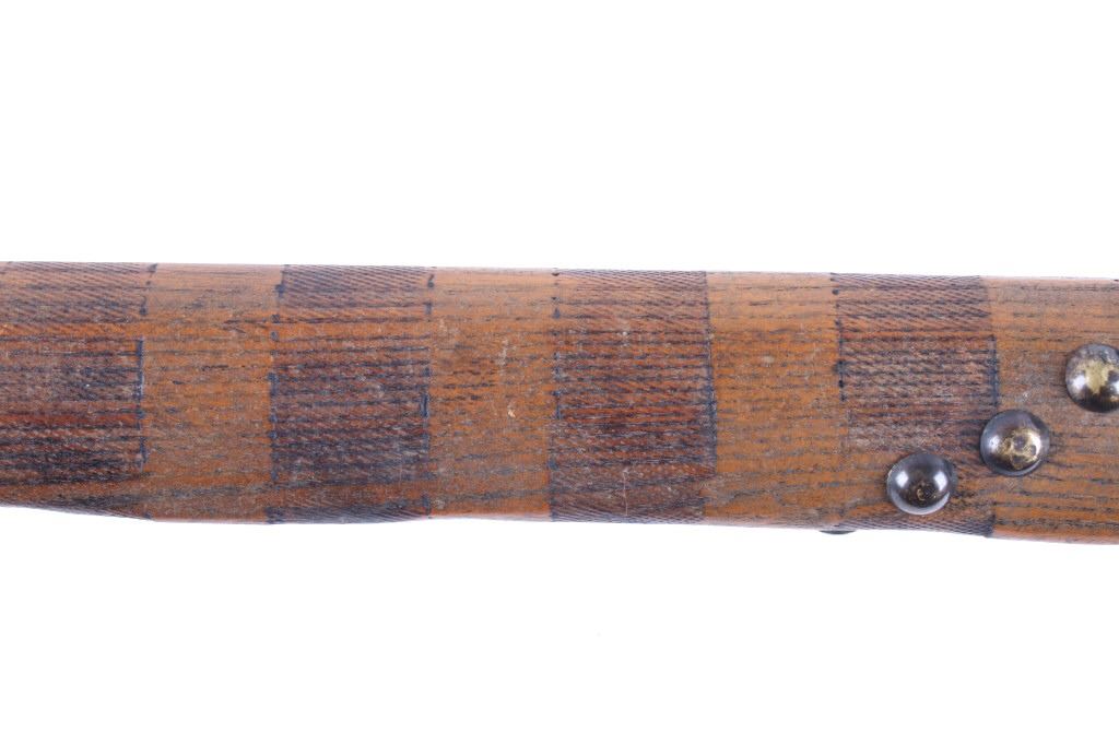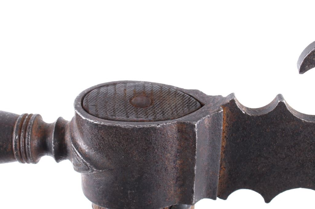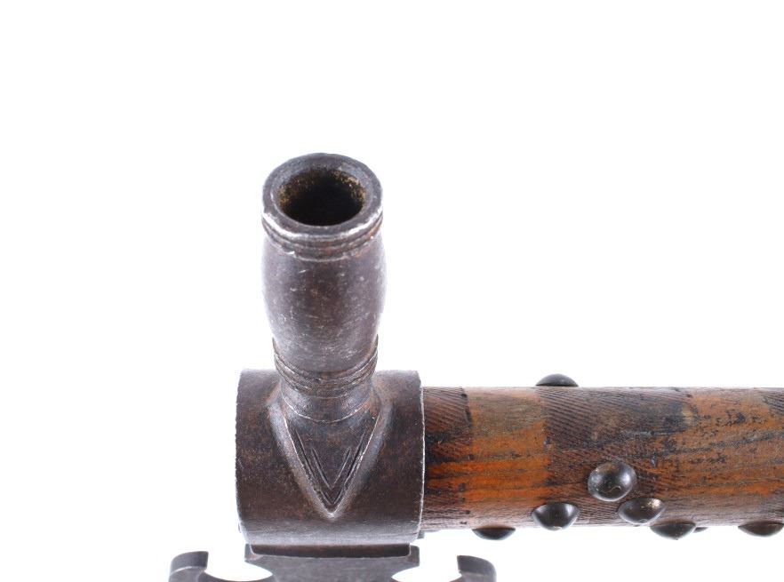 Offered for public sale is this unusual unique spontoon pipe tomahawk with Buffalo-head blade from the Sioux Native American Indians dating to the 19th Century. The piece comes with a signed letter from Barlow Antiques attributing the piece to circa 1840 to 1860 Sioux. The piece shows an iron spontoon blade which has been cut in the shape of a Great American Bison Buffalo head with pierced round cutouts for eyes and smaller cutouts for nostrils. The spontoons basal processes, which are upturned, represent the Buffalo Horns. The eyelet hole is tear drop shaped, typical of mid to late 19th Century examples and shows step moldings with filed chevron leading to the elongated thin and tall bowl with molded and filed lines on the beveled bowl; the inside of the bowl is smooth. For a very similar example see Harold L. Peterson 1965 book “American Indian Tomahawks” on page 136 figure / photograph 284 attributed to circa 1880-1900 Assiniboine Indian with Buffalo Head blade. Also see “Indian Tomahawks & Frontiersmen Belt Axes” by Hartzler and Knowles for another Buffalo Head tomahawk. This example is nearly identical to the example found to be authentic original shape and piece by the experts at Cowan’s Auction sold in their April 2013 sale from the Chandler-Pohrt Collection attributed as a Buffalo Head Pipe Tomahawk from the 19th Century. The Cowan’s piece has the identical Buffalo head. The head is secured to an ash wood haft handle with extensive hot file burned bands and a zig-zag brass trade tack pattern down two-thirds of the surface on both sides. The gripping area tapers gradually towards the smoking tip, a features also seen on many mid to late 19th Century tomahawk hafts. Just below the gripping area is a pierced hole which would have held an Indian hide wrist throng, beaded drop of hide or drop of feathers, none of which is present anymore. The smoking tip is in typical tapering form and is accented by hot file burns at the end of the haft just above the tip. The brass tacks have a dark to mellow coloring and the wood has a nice mellow coloring. The head has a dark coloring, similar to the Cowan’s piece. Provenance: From a historic Eastern Montana American Indian Collection, where the piece was found to be an authentic original, one of the finest collections of American Indian weaponry and antiquities in Montana. The piece measure 25.25”L with a head that is 10 7/8”L by 3.75”W by 1.75” thick.