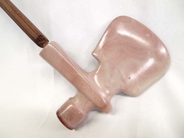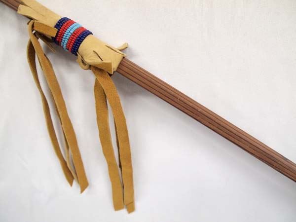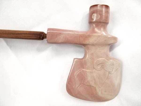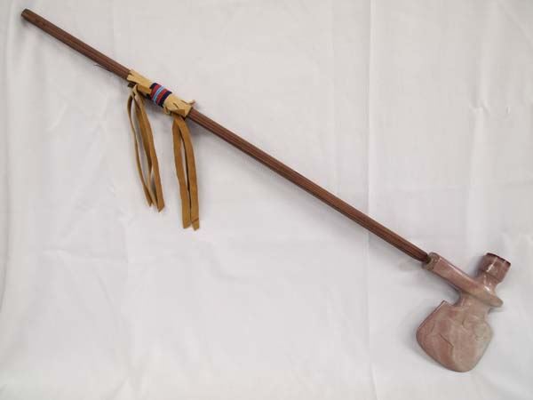 Native American Sioux Carved Pipe and Stem. This piece has a nicely carved Ram on one side and the Stem is carved wood and adorned with beaded leather. This item and measures approx. 27''L x 6''T.