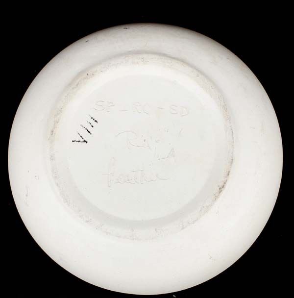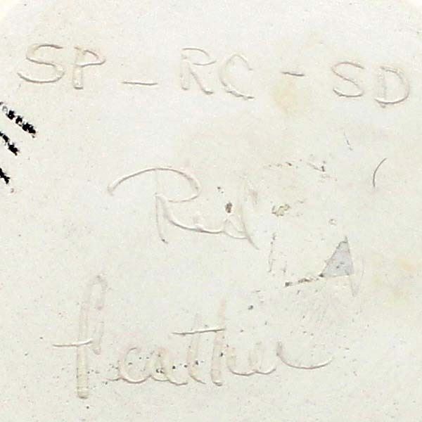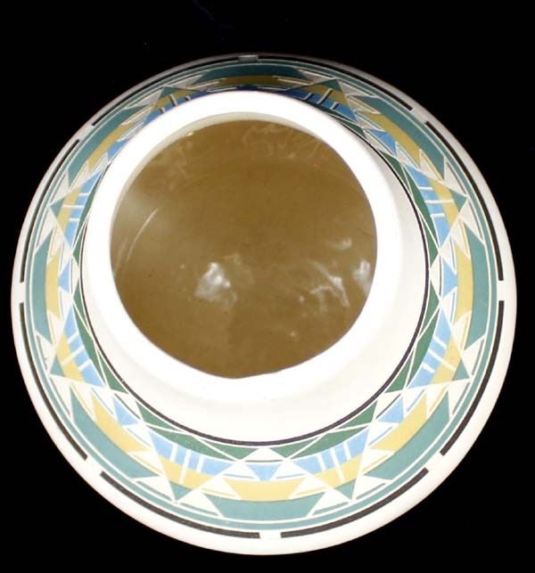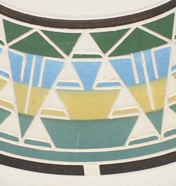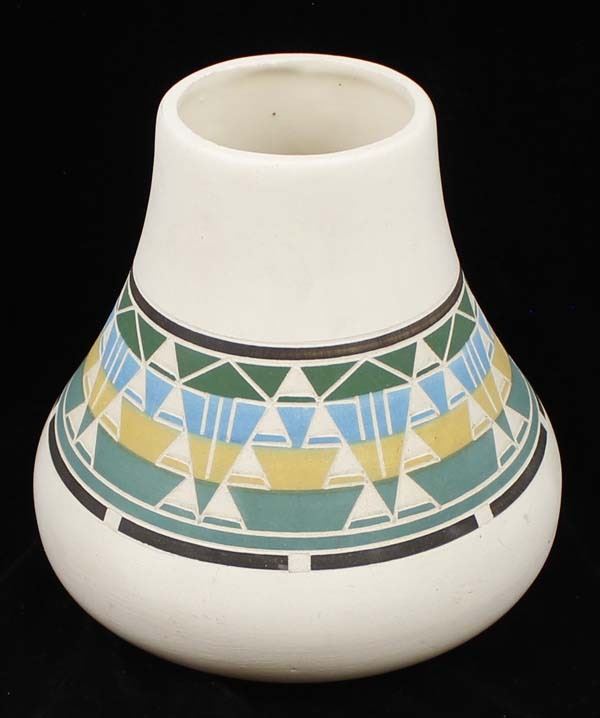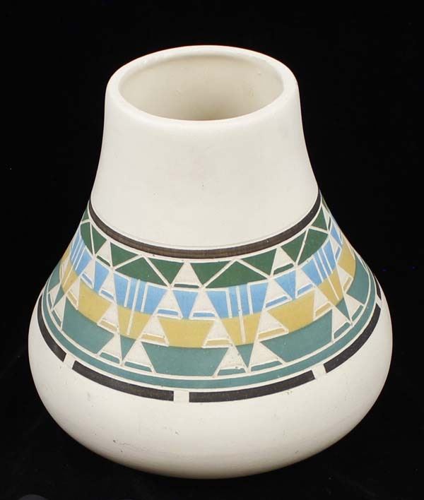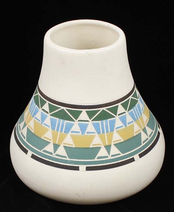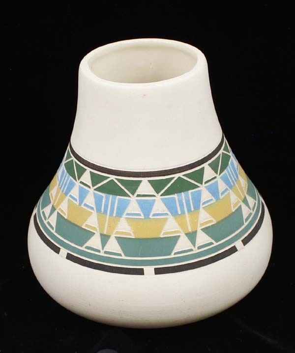 Native American Sioux Carved Ceramic Pottery Vase by Red Feather, measures 7'' x 7'' and is signed on the bottom, hand painted geometric designs, FYI: ''Delbert ~ Red Feather is his traditional Lakota name. Delbert has been at Sioux pottery since 1976 and is an enrolled member of the Rosebud tribe.''