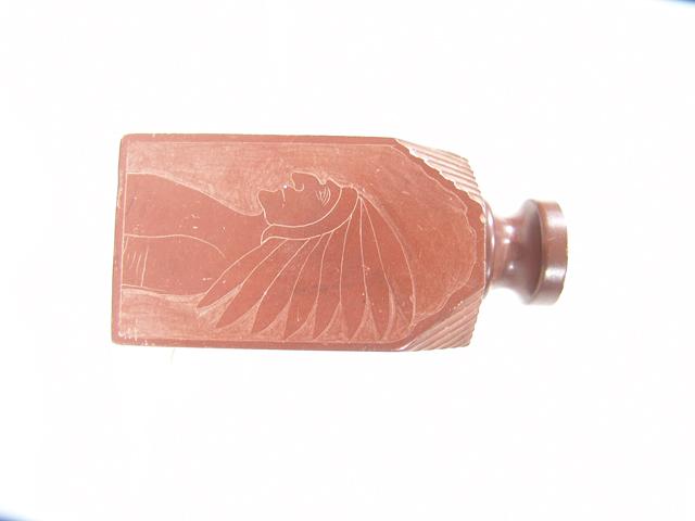 Circa 1900, Carved catlinite bottle and stopper with incised chief portraits on each side. 4-1/2" x 2" x 2"