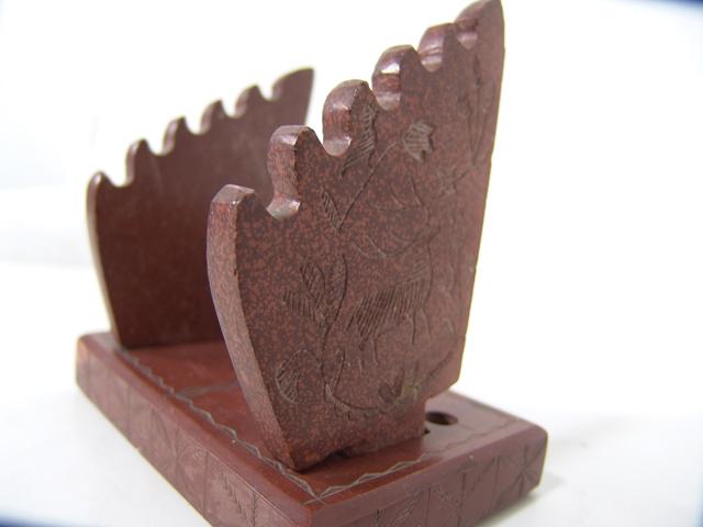 Circa 1890s, Catlinite inkwell and feather pen rest with ornate carvings of elk and foliate carvings overall; fine patina. 6" x 3-1/2" x 5"