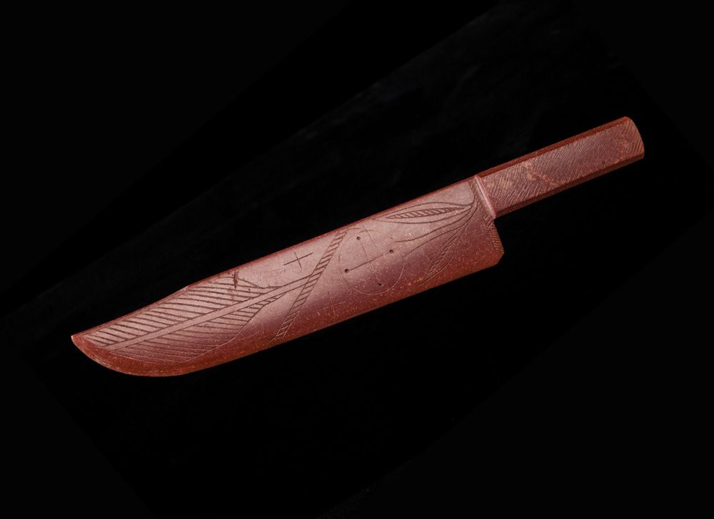 Sioux Catlinite Knife. A frontier bowie knife made from Catlinite, incised all over with floral and leaf design with crosses, most likely out of the Minnesota region. 12" long, circa 1890s.