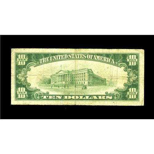 <B>Sioux Center, IA</B></I> - $10 1929 Ty. 1 <B>The First NB</B></I> Ch. # 7369<BR>Save for a single pinhole, the paper on this note is strong for the grade. Only about a dozen notes are known on this one-bank town in Northwest Iowa. <B>Fine.</B></I>