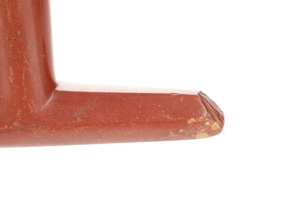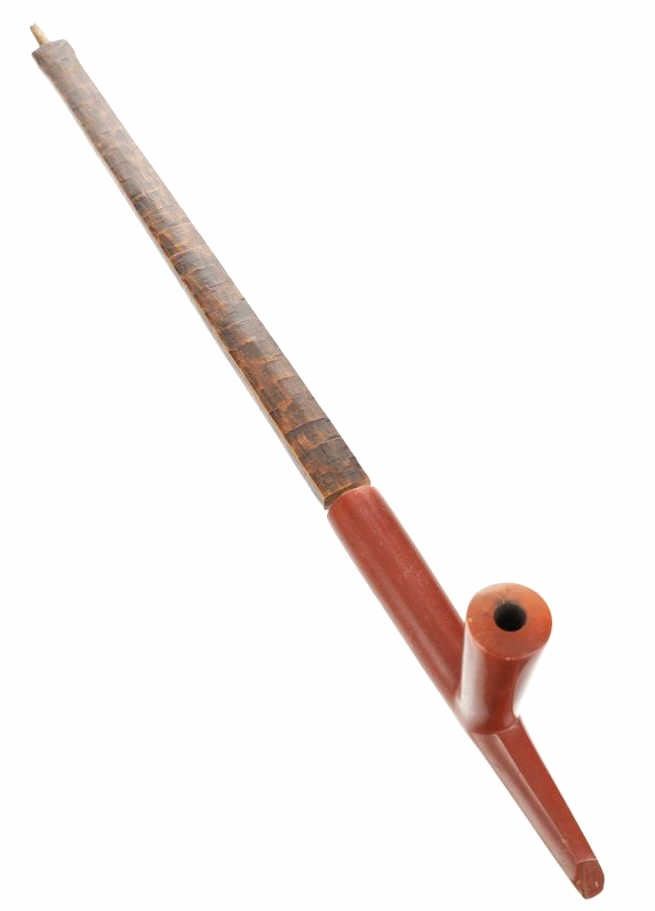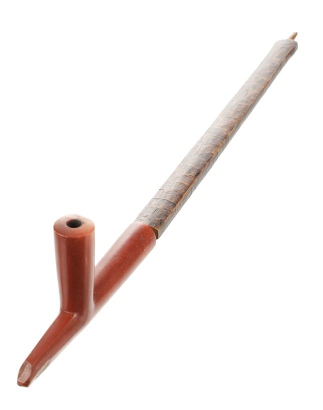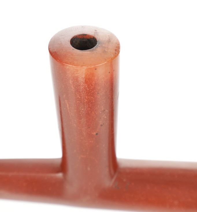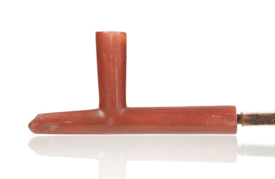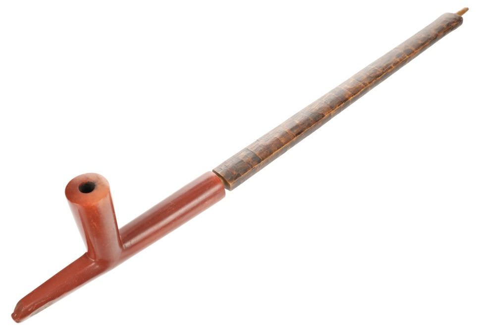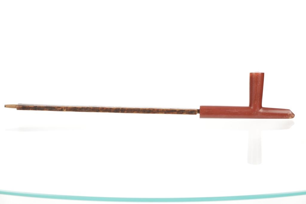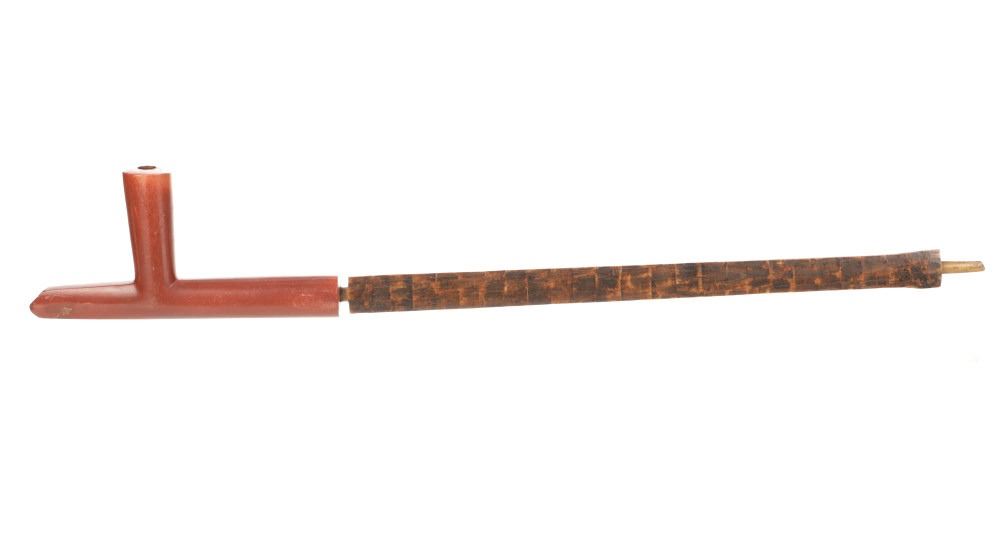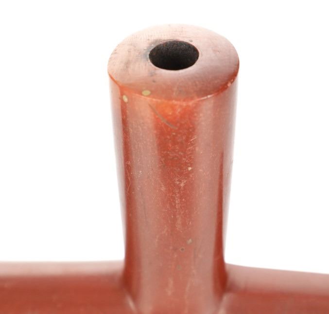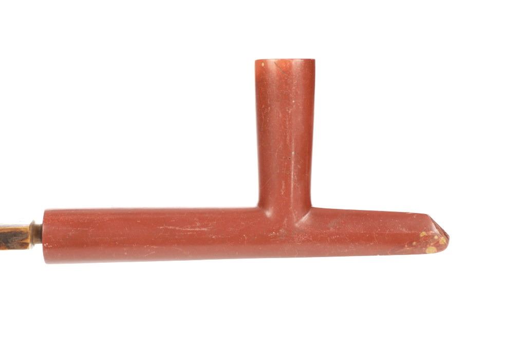 This is a phenomenal large Chief’s catalinite pipe bowl and burnished stem dating to the third quarter of the 19th Century from the Sioux Native American Indians of the Northern Plains. This circa 1850-1875’s pipe features the largest bowl we have ever offered for sale; this astounding bowl is in the traditional “T” pattern and is made of solid catalinite pipestone material with dark red to speckled pink coloring. The bowl shows a large cylindrical stem end that slightly tapers toward the tall cylindrical, slightly outward tapering bowl and end, which gradually forms from round to hexagonal with a diagonally cut beveled end; the entire base of the pipe is expertly carved flat. The bowl shows a shiny dark coloring from honest age and patina, along with a well smoked bowl, all indications from true authentic age. The piece is paired with the original solid hardwood stem that has a standard squared off pattern with slightly rounded top and bottom, which is slightly tapered in and out again at the gripping area; the stem also carries a well burnished, hot file branded finish that also has a shiny dark chocolate patina from honest authentic age and use. The smoking tip is worn away to nearly natural wood and has a slight chip at the very end. The pipe end is dark from much use. Both the bowl and pipe smoking-ends and bowl have a deep, old tobacco sent. This is truly a fantastic pipe bowl and stem with rich patina, scarce large size and from a nice collection. Provenance: From a private museum collection in the Auvergne-Rhone-Alpes region of France. For other large Chief size catlinite bowl and stem examples, see the Sioux Calumet stem and Catlinite bowl sold by Cowan's Auction in 2013 for $23,000; the Sioux Catlinite bowl and stem also sold by Cowan's for $10,000 in 2019; the Sioux Chief Catlinite pipe and stem c. 1890 sold by our company in 2014 for $4,300; and the Central Plains Catlinite bowl and stem sold by Skinner Auction in 2011 for $4,750. The pipe measures together 29 inches in length, with the bowl itself being 9 3/8 inches long by 4.75 inches tall and 1.5 inches wide and the bowl opening being just over a ½ inch.