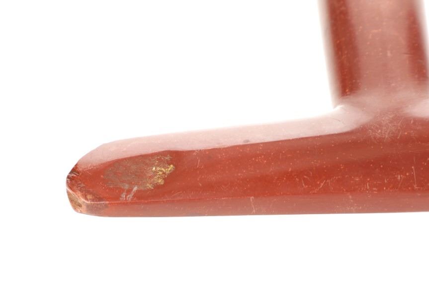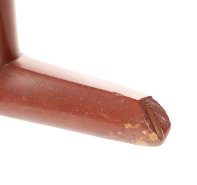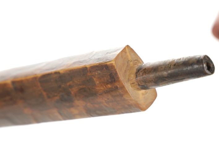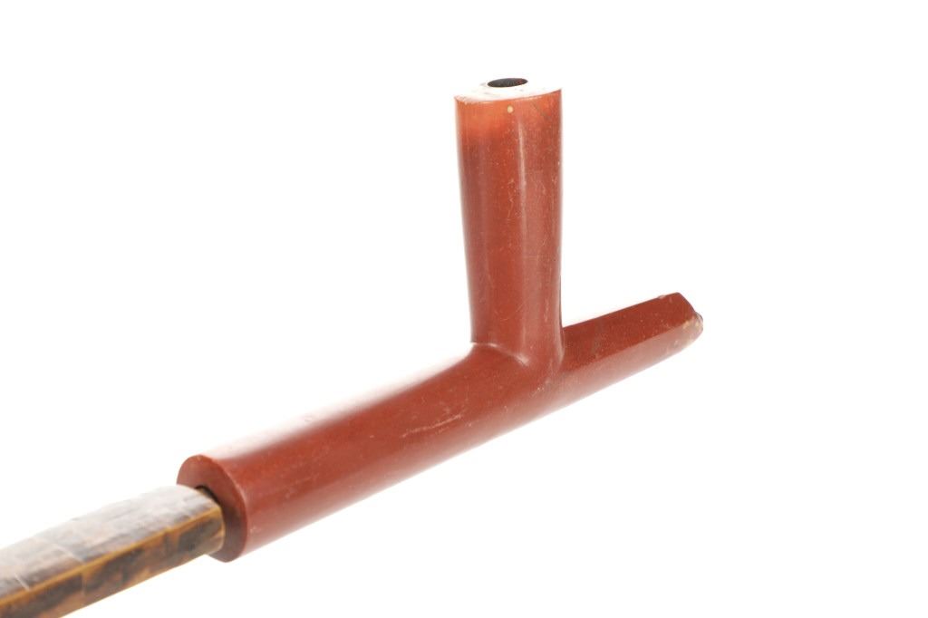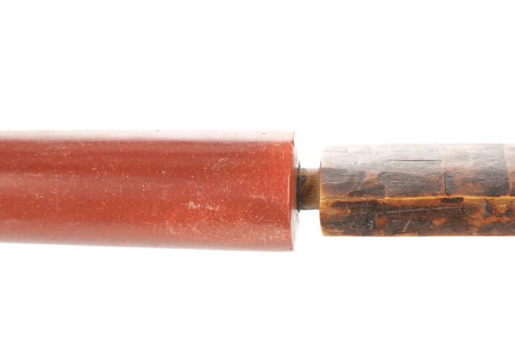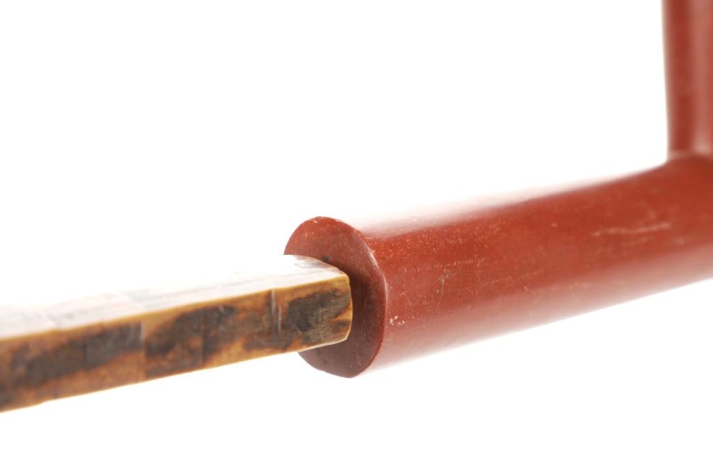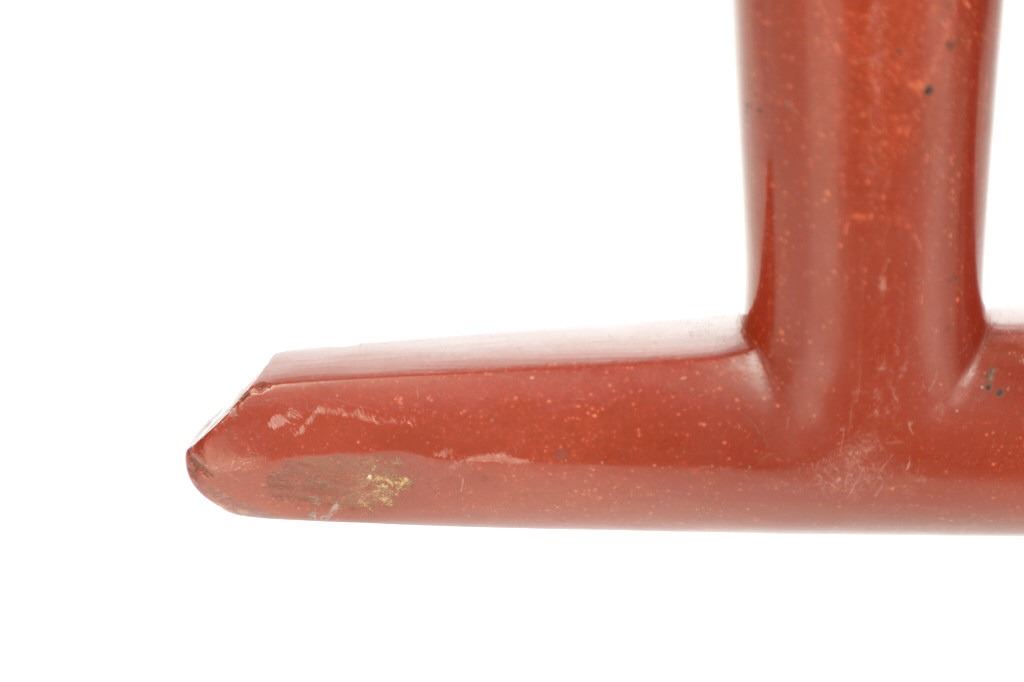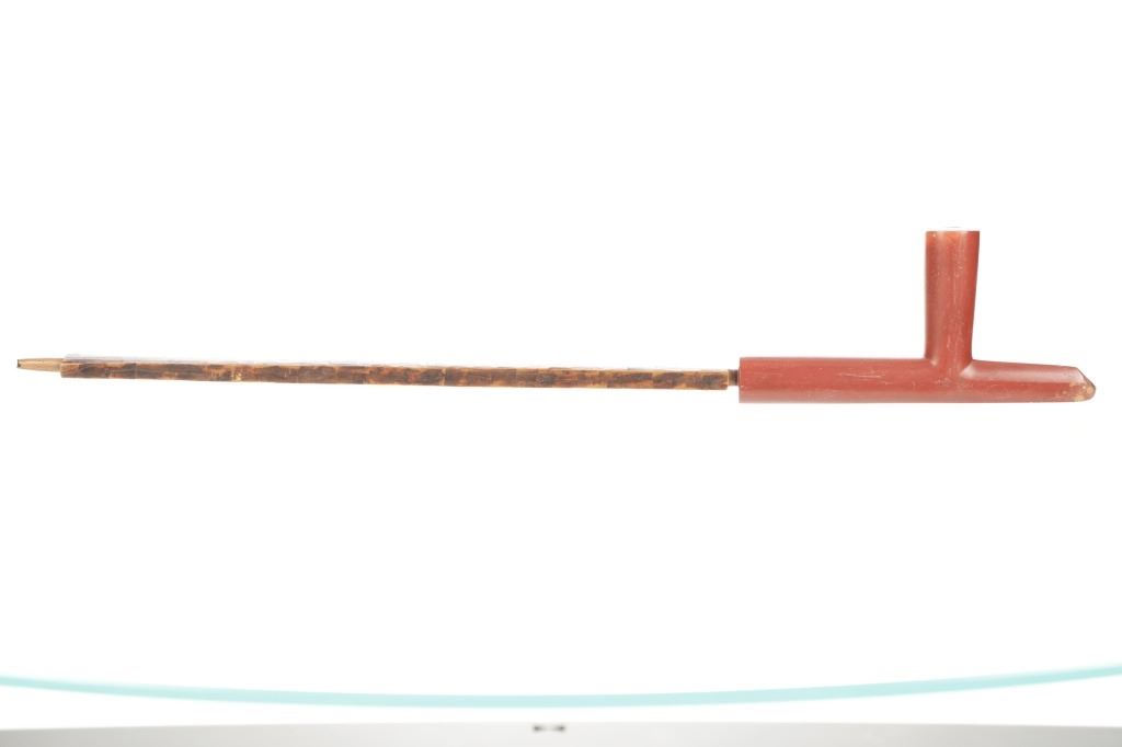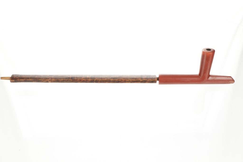 This is a phenomenal large Chief’s catalinite pipe bowl and burnished stem dating to the third quarter of the 19th Century from the Sioux Native American Indians of the Northern Plains. This circa 1850-1875’s pipe features the largest bowl we have ever offered for sale; this astounding bowl is in the traditional “T” pattern and is made of solid catalinite pipestone material with dark red to speckled pink coloring. The bowl shows a large cylindrical stem end that slightly tapers toward the tall cylindrical, slightly outward tapering bowl and end, which gradually forms from round to hexagonal with a diagonally cut beveled end; the entire base of the pipe is expertly carved flat. The bowl shows a shiny dark coloring from honest age and patina, along with a well smoked bowl, all indications from true authentic age. The piece is paired with the original solid hardwood stem that has a standard squared off pattern with slightly rounded top and bottom, which is slightly tapered in and out again at the gripping area; the stem also carries a well burnished, hot file branded finish that also has a shiny dark chocolate patina from honest authentic age and use. The smoking tip is worn away to nearly natural wood and has a slight chip at the very end. The pipe end is dark from much use. Both the bowl and pipe smoking-ends and bowl have a deep, old tobacco sent. This is truly a fantastic pipe bowl and stem with rich patina, scarce large size and from a nice collection. Provenance: From a private museum collection in the Auvergne-Rhone-Alpes region of France. For other large Chief size catlinite bowl and stem examples, see the Sioux Calumet stem and Catlinite bowl sold by Cowan's Auction in 2013 for $23,000; the Sioux Catlinite bowl and stem also sold by Cowan's for $10,000 in 2019; the Sioux Chief Catlinite pipe and stem c. 1890 sold by our company in 2014 for $4,300; and the Central Plains Catlinite bowl and stem sold by Skinner Auction in 2011 for $4,750. The pipe measures together 29 inches in length, with the bowl itself being 9 3/8 inches long by 4.75 inches tall and 1.5 inches wide and the bowl opening being just over a ½ inch.