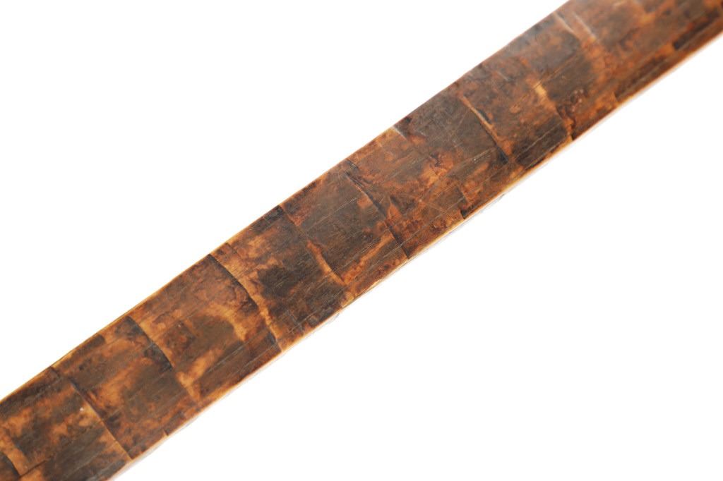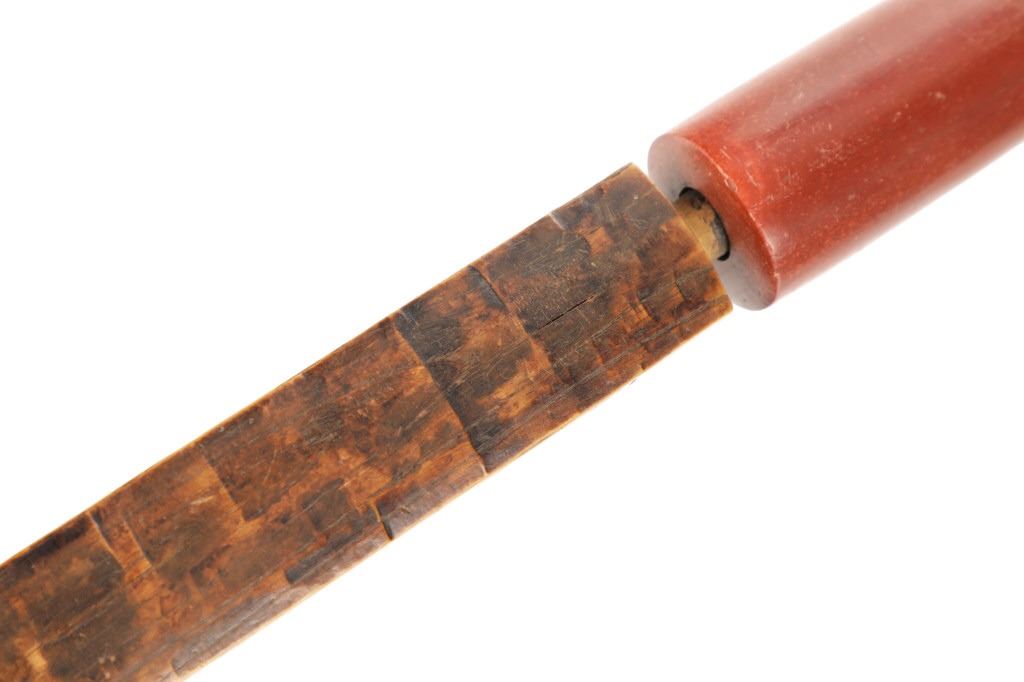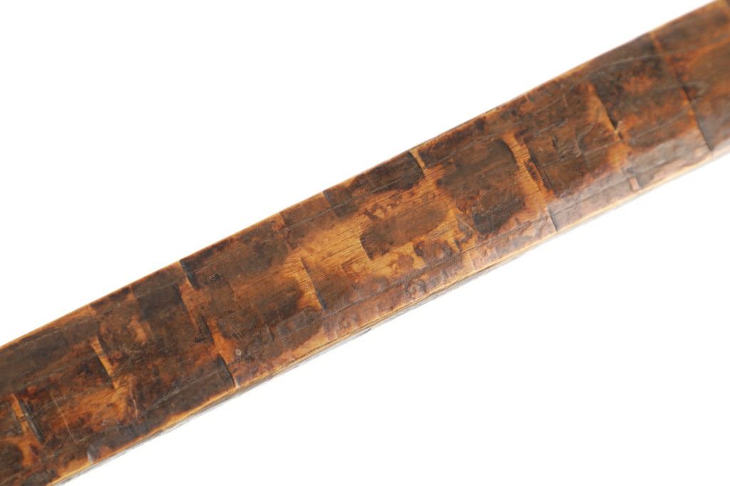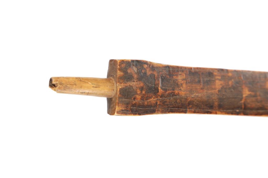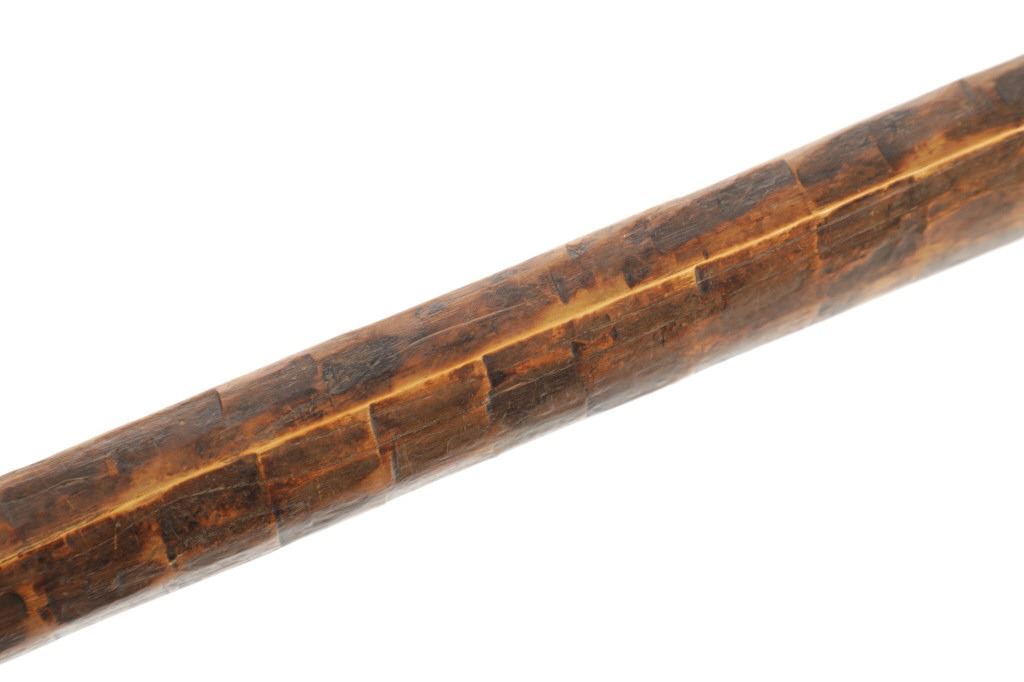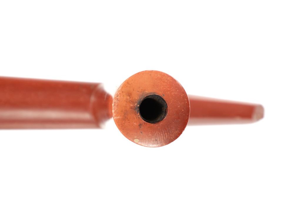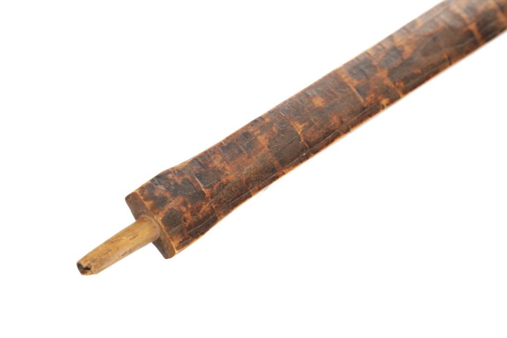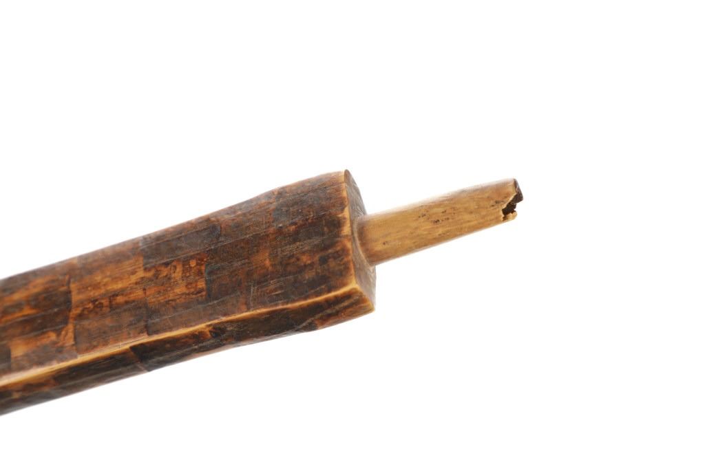 This is a phenomenal large Chief’s catalinite pipe bowl and burnished stem dating to the third quarter of the 19th Century from the Sioux Native American Indians of the Northern Plains. This circa 1850-1875’s pipe features the largest bowl we have ever offered for sale; this astounding bowl is in the traditional “T” pattern and is made of solid catalinite pipestone material with dark red to speckled pink coloring. The bowl shows a large cylindrical stem end that slightly tapers toward the tall cylindrical, slightly outward tapering bowl and end, which gradually forms from round to hexagonal with a diagonally cut beveled end; the entire base of the pipe is expertly carved flat. The bowl shows a shiny dark coloring from honest age and patina, along with a well smoked bowl, all indications from true authentic age. The piece is paired with the original solid hardwood stem that has a standard squared off pattern with slightly rounded top and bottom, which is slightly tapered in and out again at the gripping area; the stem also carries a well burnished, hot file branded finish that also has a shiny dark chocolate patina from honest authentic age and use. The smoking tip is worn away to nearly natural wood and has a slight chip at the very end. The pipe end is dark from much use. Both the bowl and pipe smoking-ends and bowl have a deep, old tobacco sent. This is truly a fantastic pipe bowl and stem with rich patina, scarce large size and from a nice collection. Provenance: From a private museum collection in the Auvergne-Rhone-Alpes region of France. For other large Chief size catlinite bowl and stem examples, see the Sioux Calumet stem and Catlinite bowl sold by Cowan's Auction in 2013 for $23,000; the Sioux Catlinite bowl and stem also sold by Cowan's for $10,000 in 2019; the Sioux Chief Catlinite pipe and stem c. 1890 sold by our company in 2014 for $4,300; and the Central Plains Catlinite bowl and stem sold by Skinner Auction in 2011 for $4,750. The pipe measures together 29 inches in length, with the bowl itself being 9 3/8 inches long by 4.75 inches tall and 1.5 inches wide and the bowl opening being just over a ½ inch.