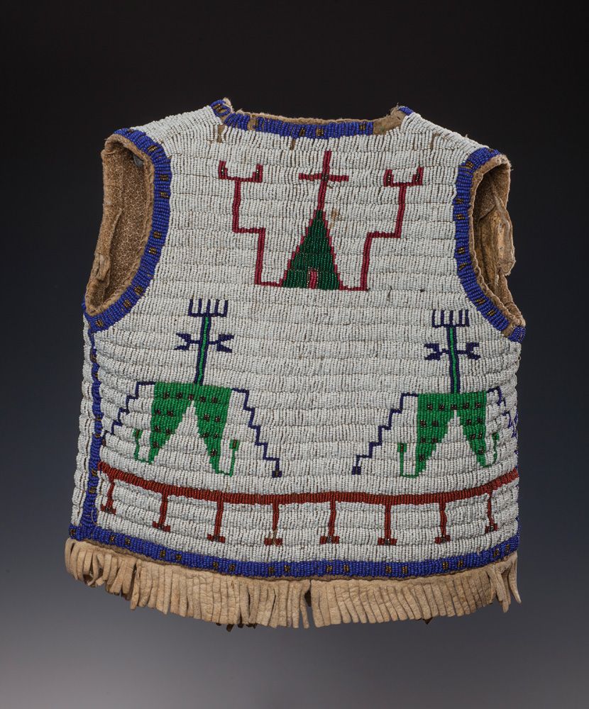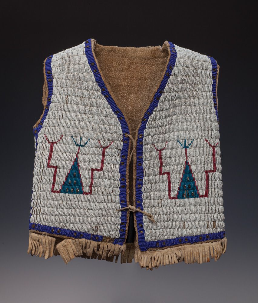 Sioux Child's Beaded Vest. Fully beaded vest with white field and blue, red, and gold (brass) designs of tipis and spirits. Fringe attached to the bottom, cloth lined. Slight bead loss overall. Circa 1920s, 14" tall by 12" across (flat).