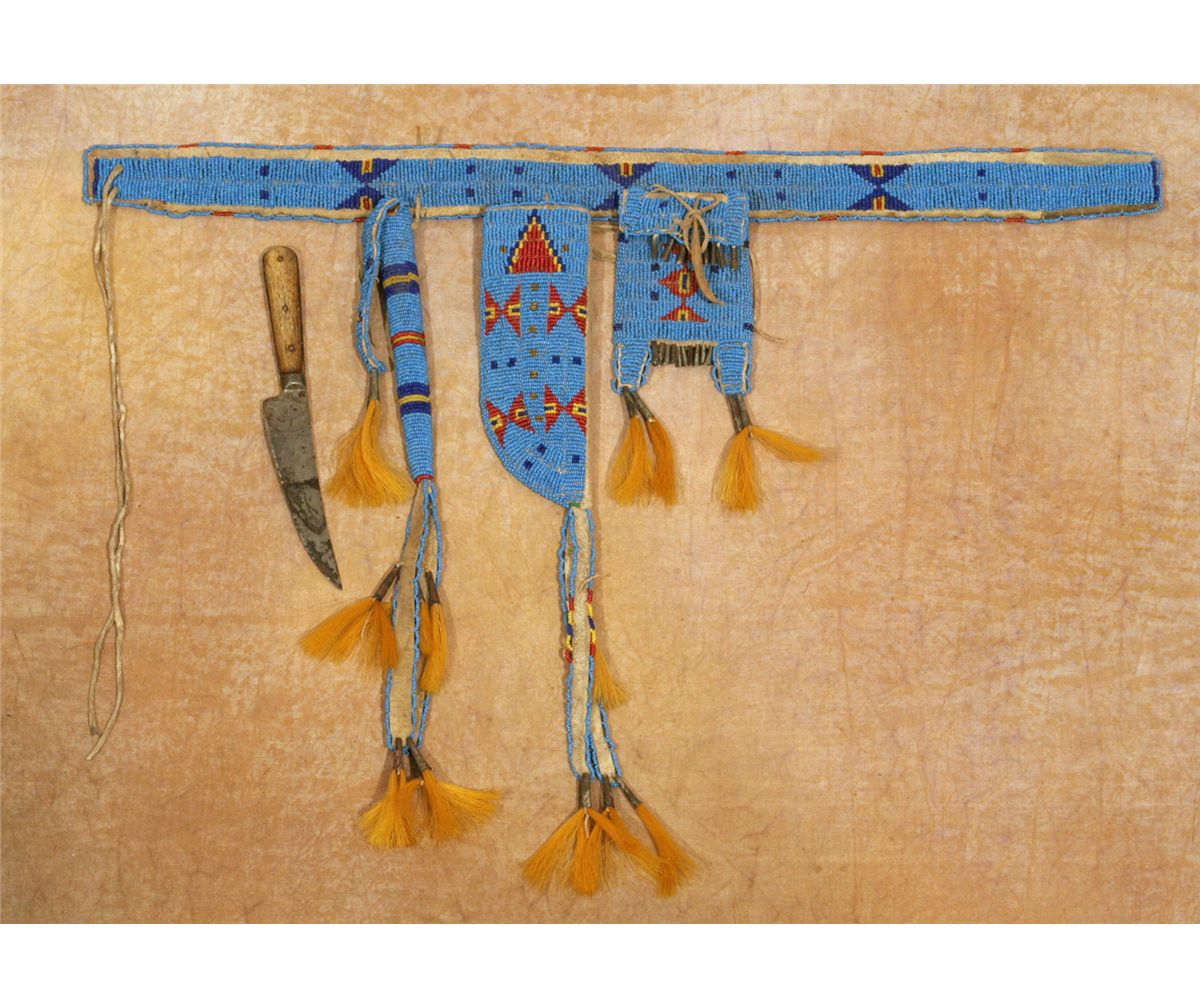 Sioux Child's Set - Knife Case, Awl Case and Bag. Set includes 7" knife case with two 8" edge-beaded drops. 7" fully beaded awl case is attached, also decorated with edge-beaded drops. 5" x 3" beaded bag. All are beaded in a classic design on a desirable blue background and decorated with horsehair filled tin cones. Very difficult to find with all elements present and in original condition. 19th century. Provenance: Ex-Wintersteen collection.