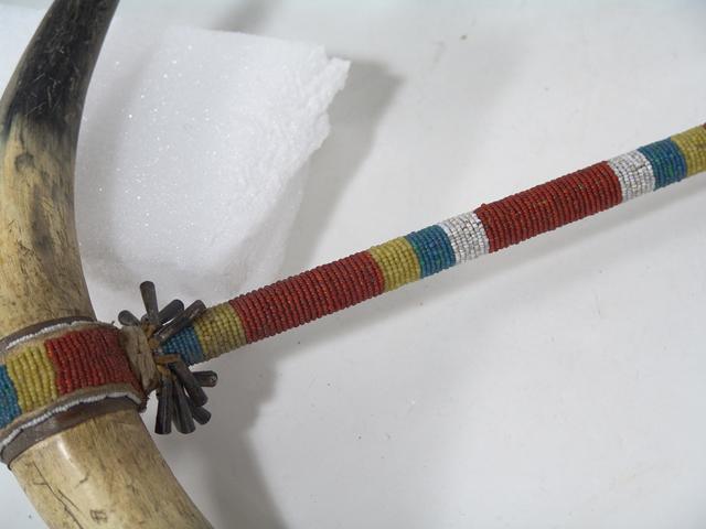 Early 1900s, Double cow horns mounted on a fully beaded handle with tin cone tinklers. 22-1/2" x 12"