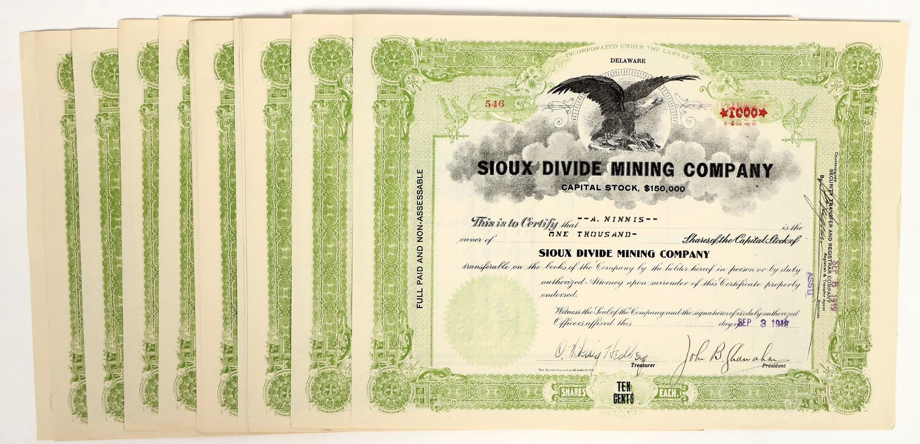 About 20 Sioux Divide Mining Company Stocks c.1919. Issued. Signed by President John B. Shanahan. See photos.