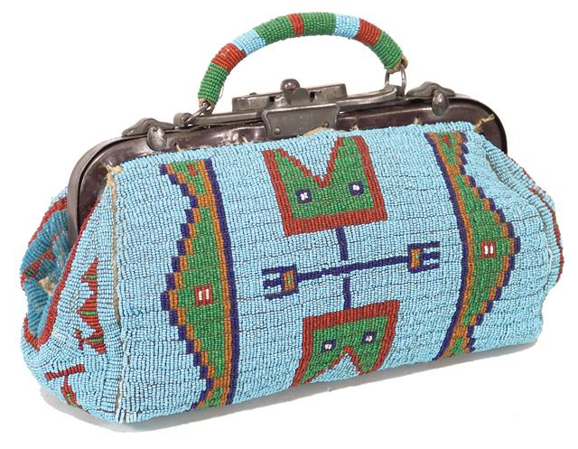 Late 1800s/Early 1900s, Rare, early, classic fully beaded (on all sides and bottom) doctor's bag, sinew sewn on buffalo hide; all original, no restoration; superb condition. 7" x 8-1/2" x 14"