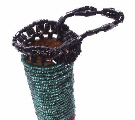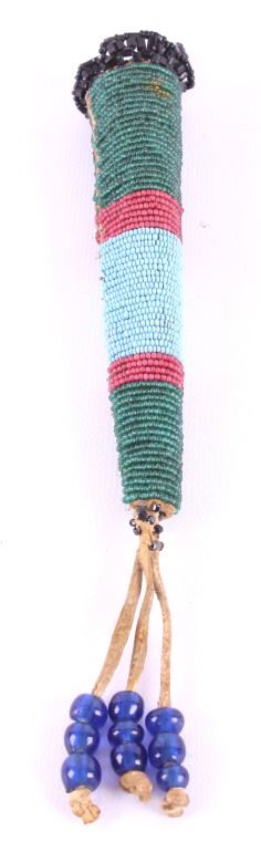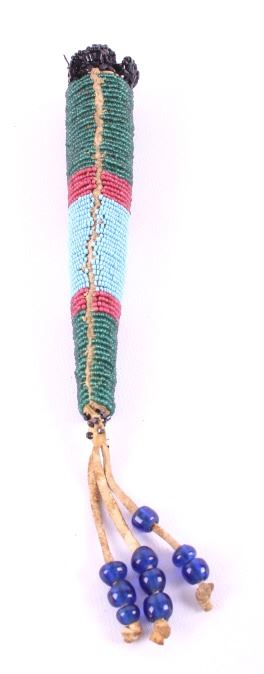 The lot features a Sioux Native Ameircan Indian fully beaded awl case dating to the 19th Century. The case shows a parfelche lining that is covered in Indian tanned hide and accented by period correct early glass trade seed beads sewn with sinew. The beadwork shows a wonderful geometric linear pattern in sky padre blue, red white-heart and semi-transparent green. At the opening is a fancy beaded fringe with faceted and seed beads in a black color with a matched beaded top loop. The base shows three Indian hide fringe with iridescent seed beads and nine cobalt blue wound glass early trade beads. The case would have held a bone awl, a slender pointed tool that allowed the user to puncture thick hides such as Buffalo. The case shows very good overall condition and an early age. From a large Cowboy and Native American Indian collection in Montana. Measures 10" x 1".