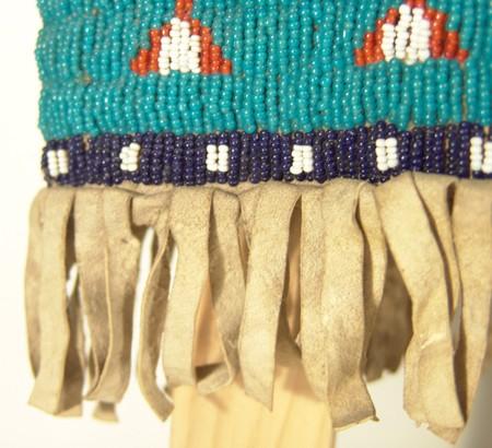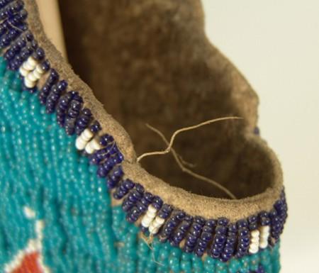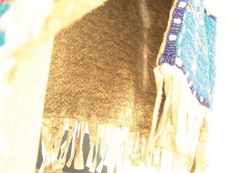 (relisted - was lot 23) Colorful sinew sewn and lazy stitch beaded buffalo hide vest with whiteheart beads, traditional symbols, and fringed bottom. Ben Thompson's first beadwork purchase from Col. Ray Vietzen, Elvira, Ohio in 1947! Condition: very good. 17" long