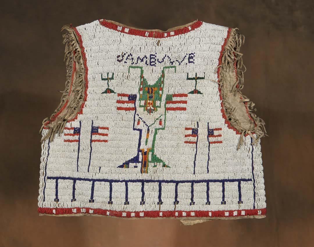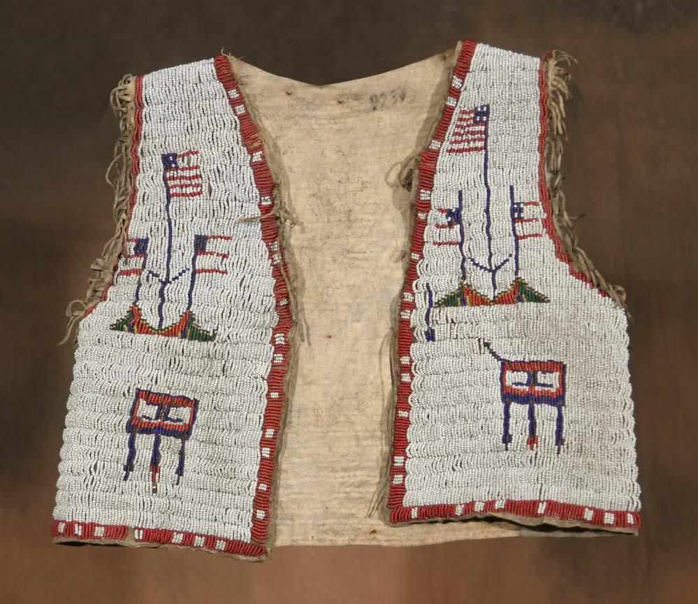Sioux Beaded Child's Vest. 13" x 15". Fully beaded both sides, fringed. Pictorial flag designs. 19th century. (est $3,000-4,000). For condition reports please visit: www.auctioninsantafe.com/cr2011.pdf