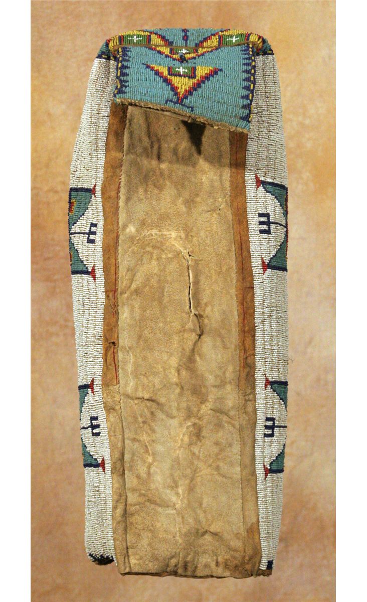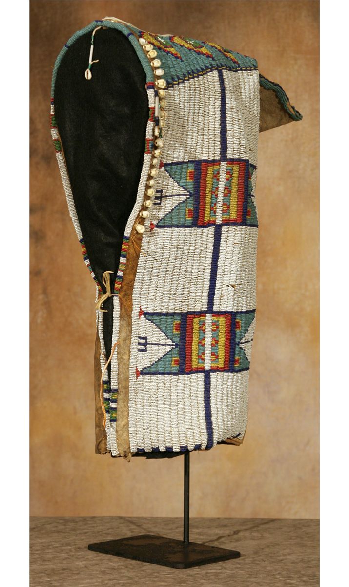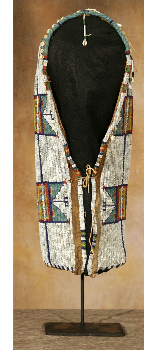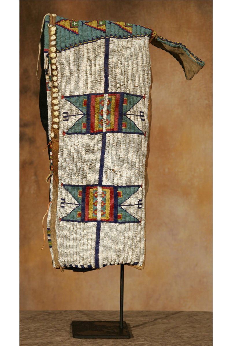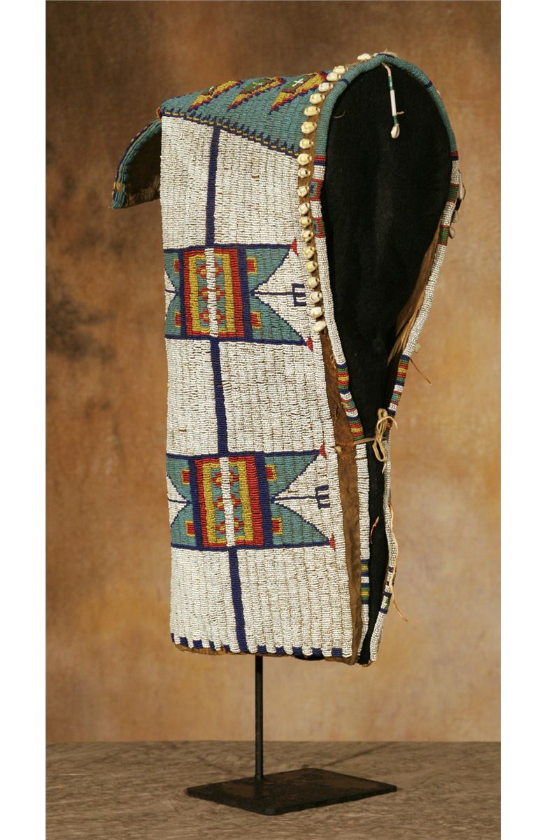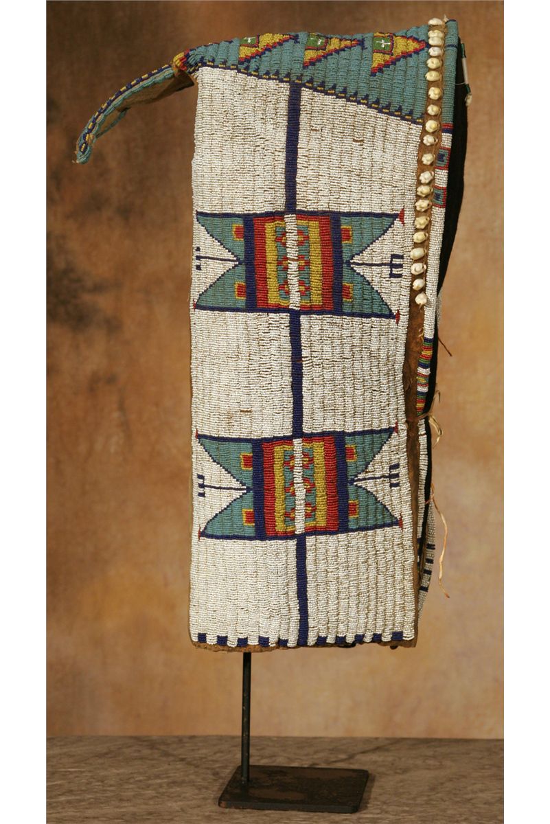 Sioux Cradle. 22" tall. Fully beaded in geometric designs, white beaded background transitions to pale blue across the top and tab. Other bead colors include yellow, white-heart red, cobalt and green. The beaded design continues around the front edge and is separated by remnants of cowrie shells and bugle beaded drops. Displayed on a custom stand which is included. Circa 1890-1900. Provenance and literature: Collection of Dr. Delwin and Karen Bokelman, PA., and pictured in their book Precious Dreams, page 11.