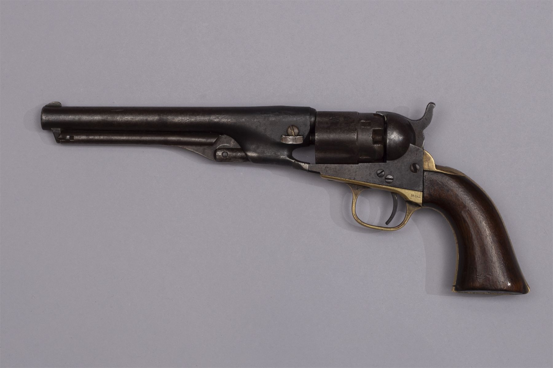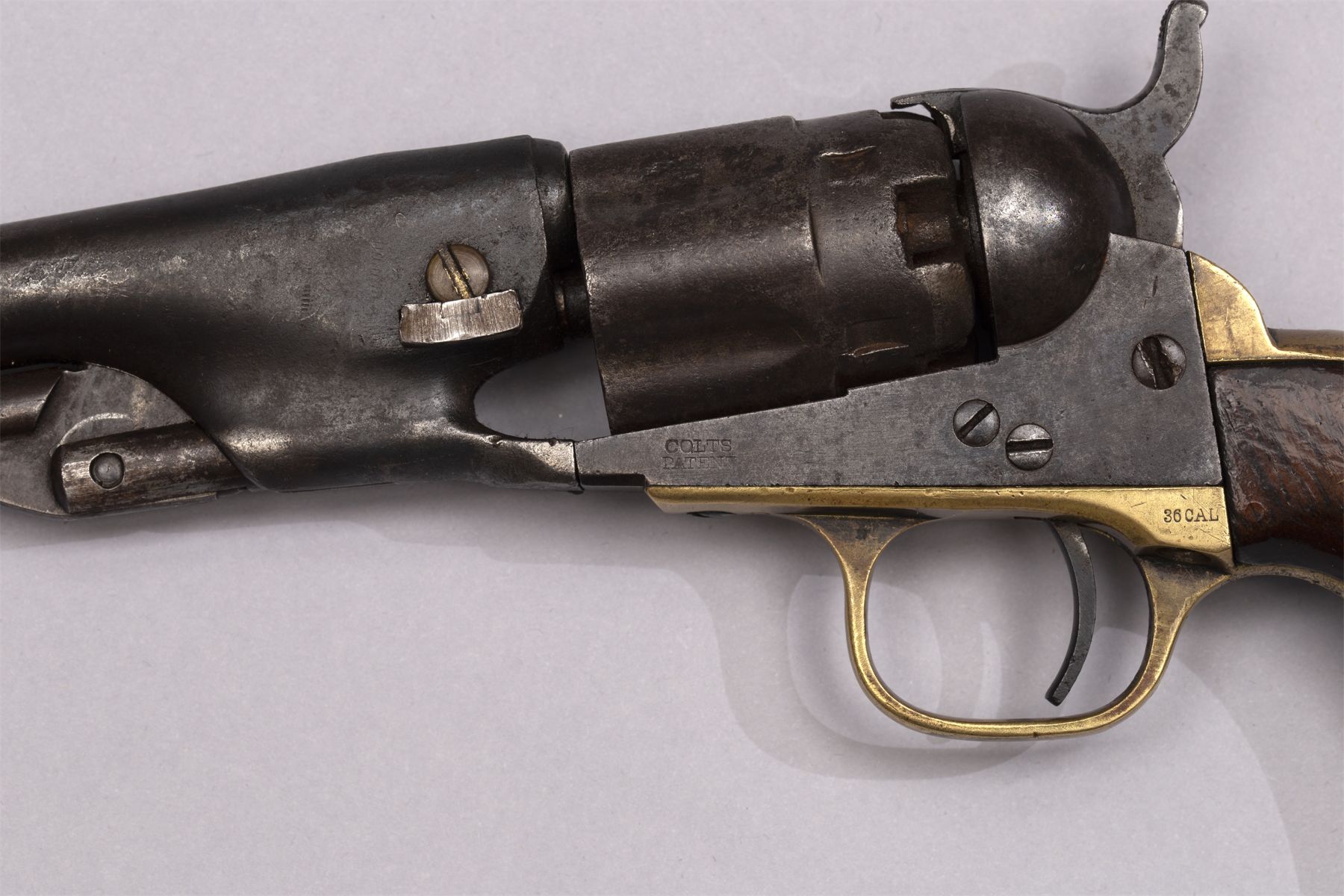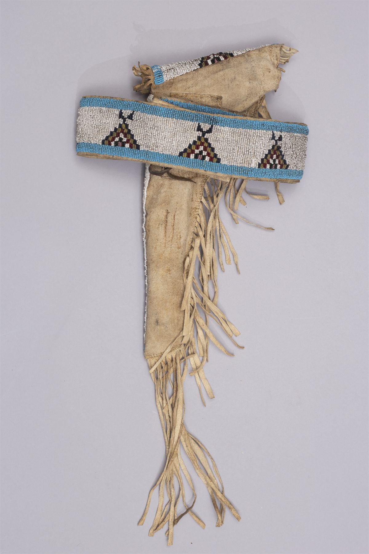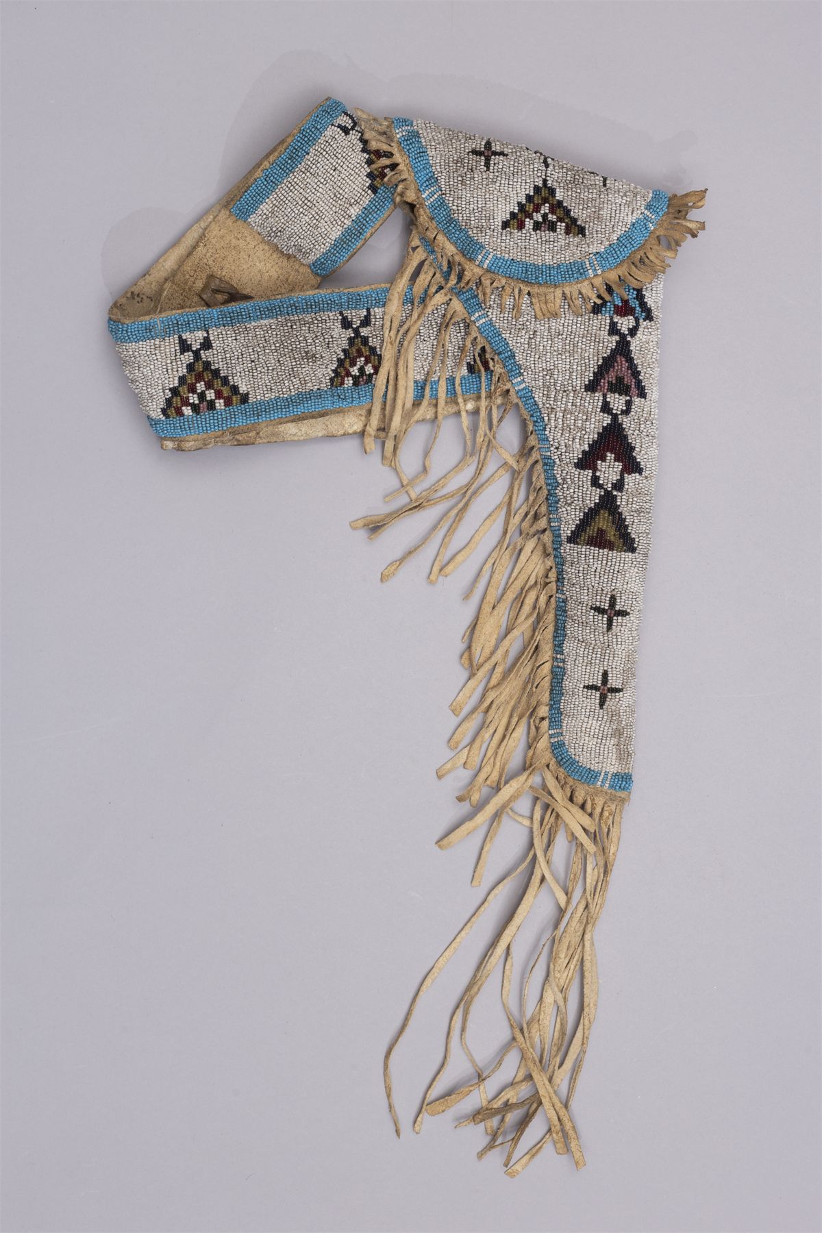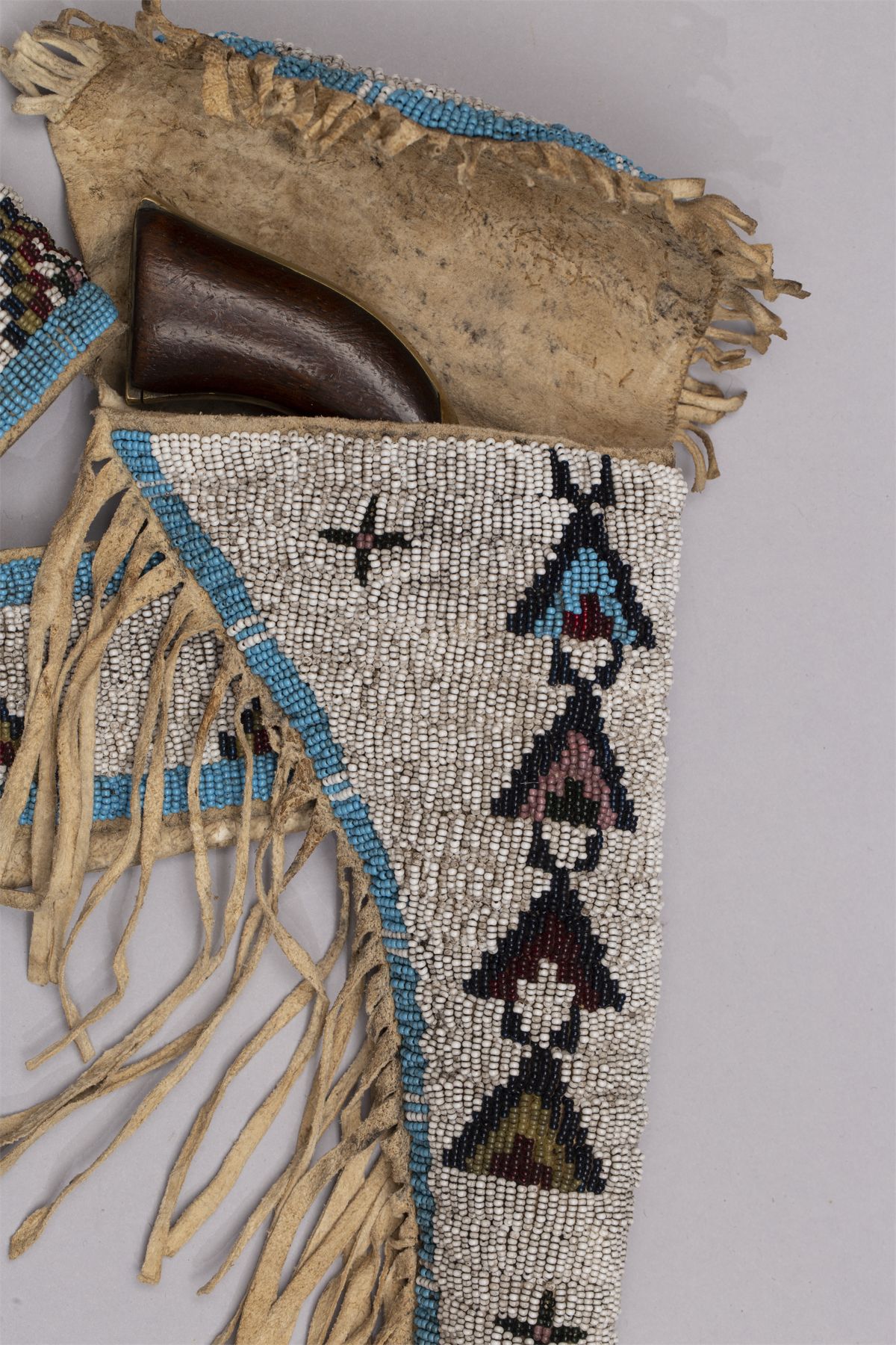 Sioux fully beaded holster and belt with a white background and light blue beaded trim, with designs of teepees and crosses in navy, brown, cobalt and pink beads. Belt is approx. 37" L x 2 3/4" W, with fringe on holster. Holster 13 1/2" without fringe. Includes an Antique Colt Model 1862 Pocket revolver, .36 caliber, Serial Number 33360 stamped in 4 places. Faint barrel markings and fitted with nice walnut grips.