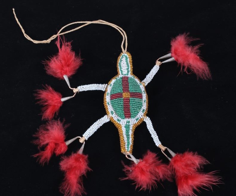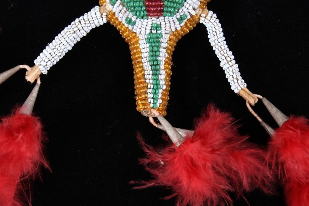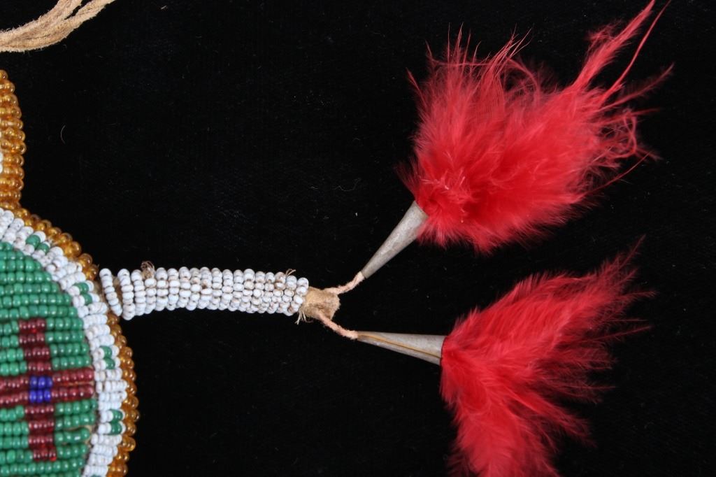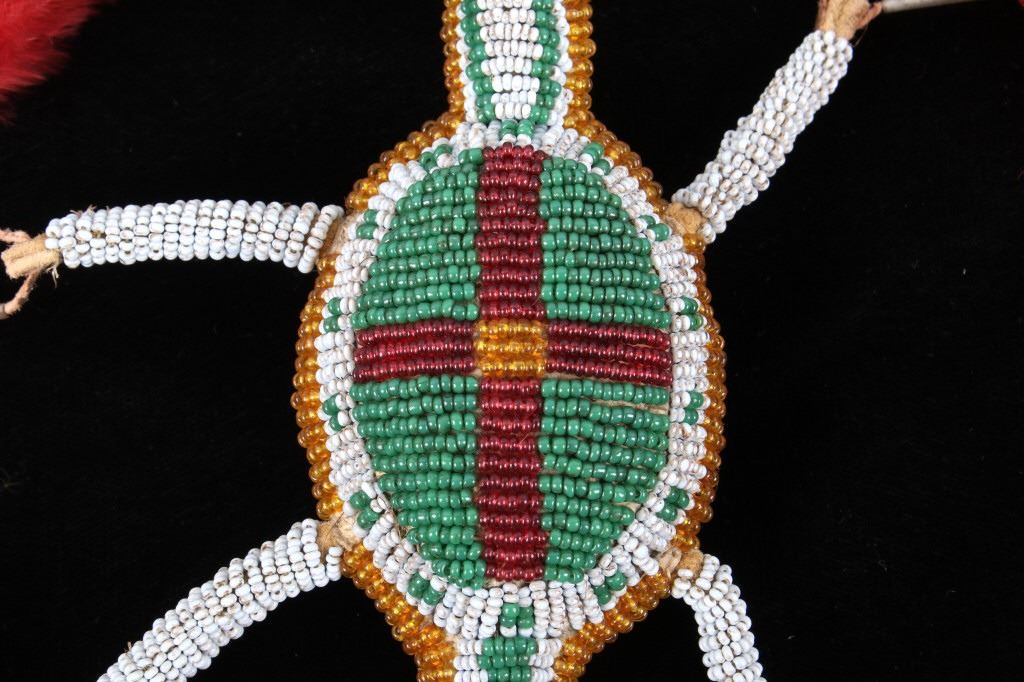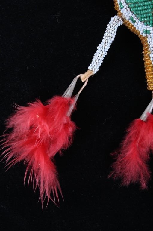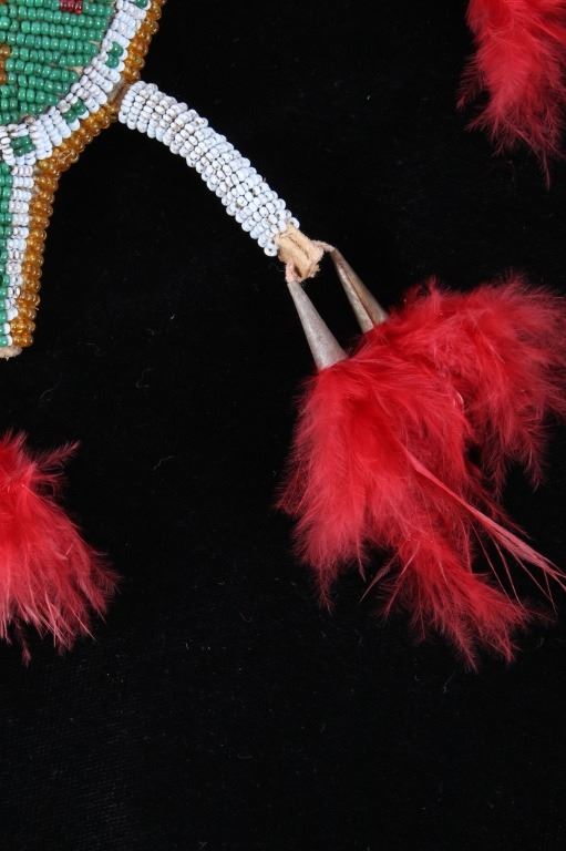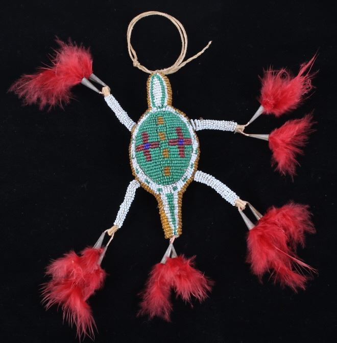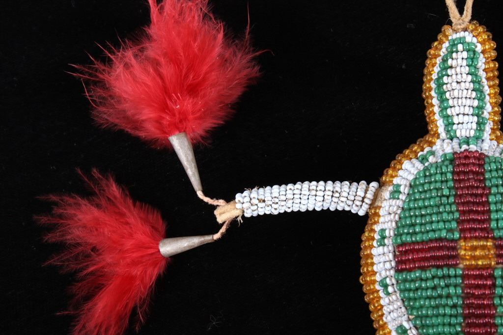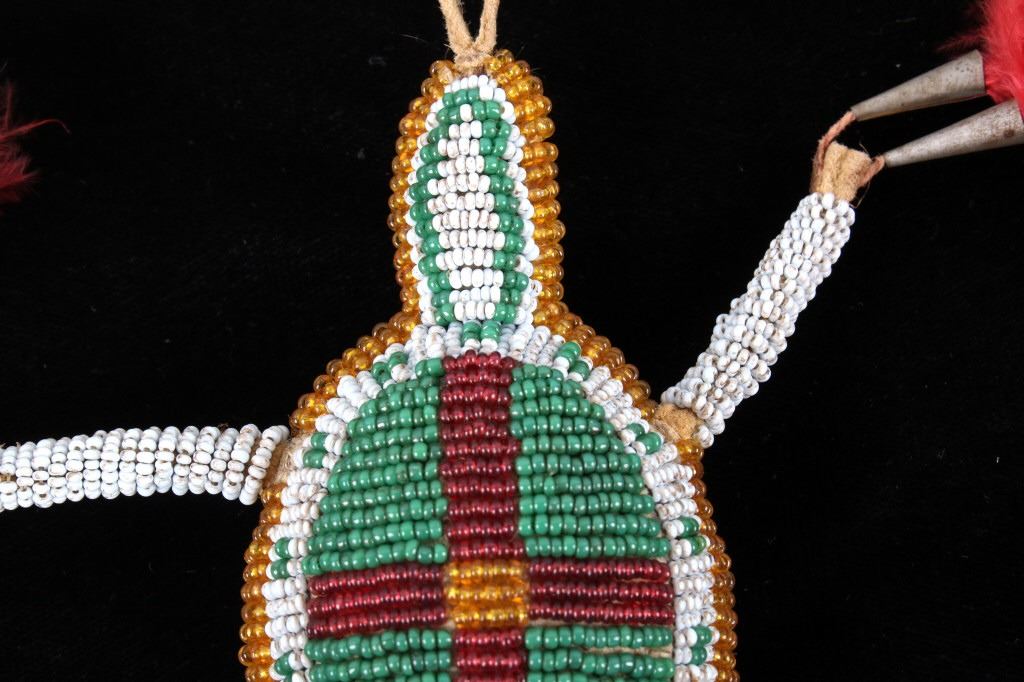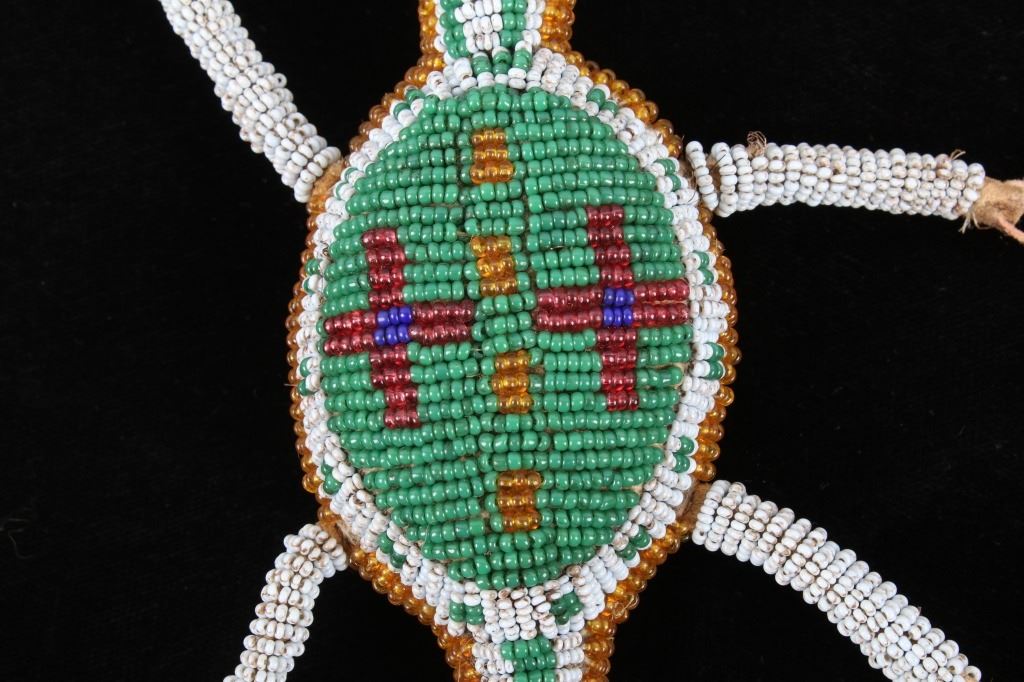 The lot features an early 1900 fully beaded turtle effigy umbilical cord fetish from the Sioux Native American Indians. The piece shows an Indian tanned hide construction that is completely covered in early glass trade seed beadwork in a geometric pattern with colors of greasy rose, amber, medium green and chalk white. The piece shows an oval stuffed shape with protruding head and triangular tail and rope beaded fringe for arms each showing two rolled tin jingle cones with red plume feathers. The top of the fetish shows an Indian tanned hide strap. These were said to be filled with the umbilical cord of the newly born and worn around their neck. Provenance: From a historic Eastern Montana American Indian Collection, where the piece was found to be an authentic original, one of the finest collections of American Indian weaponry and antiquities in Montana. Both are approximately 5”L with the fringe and strap being 14”L by 5”W without feathers.