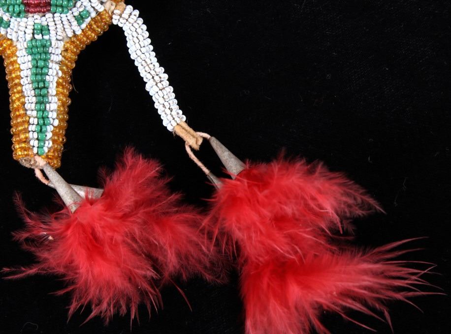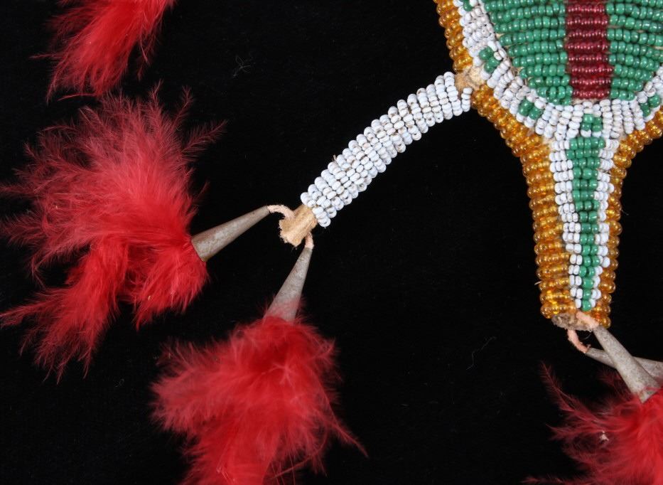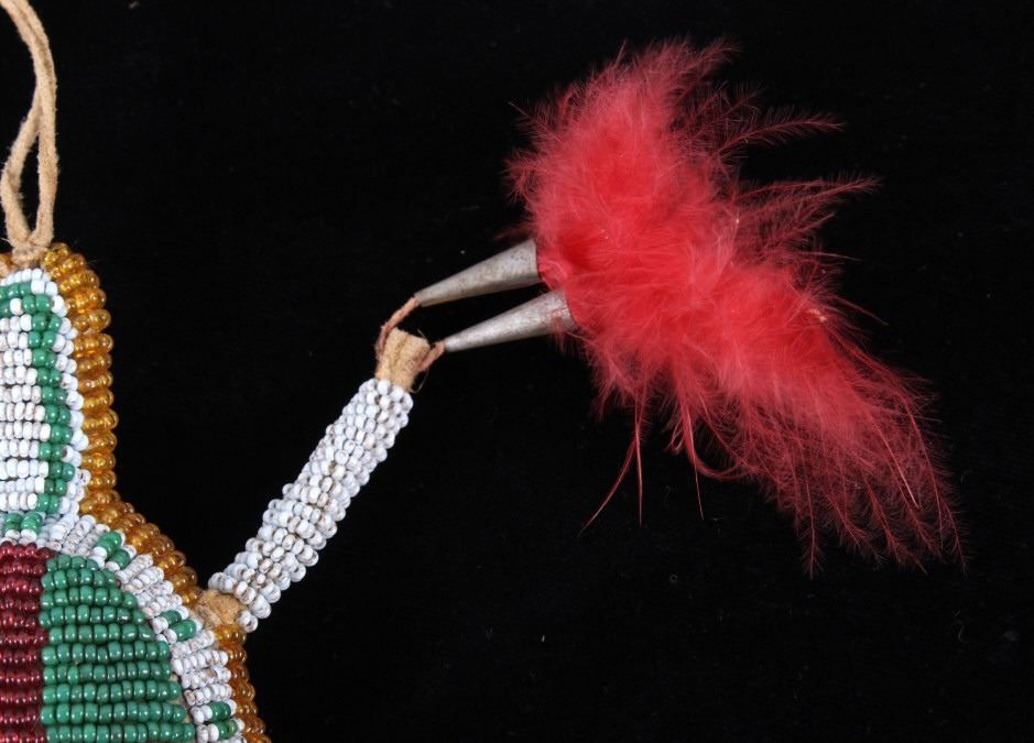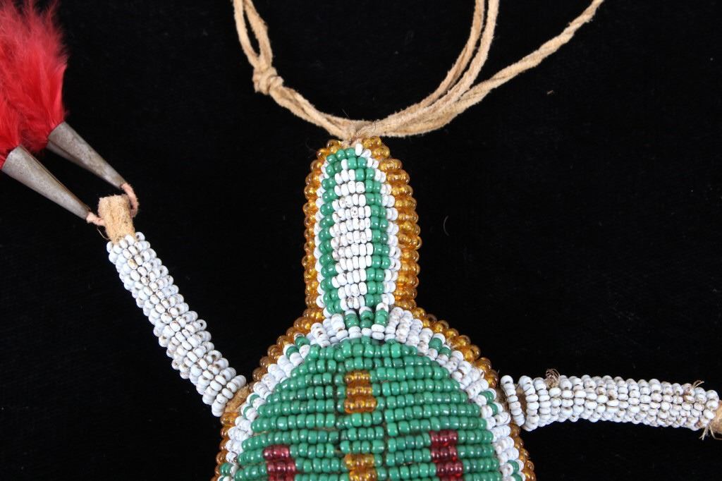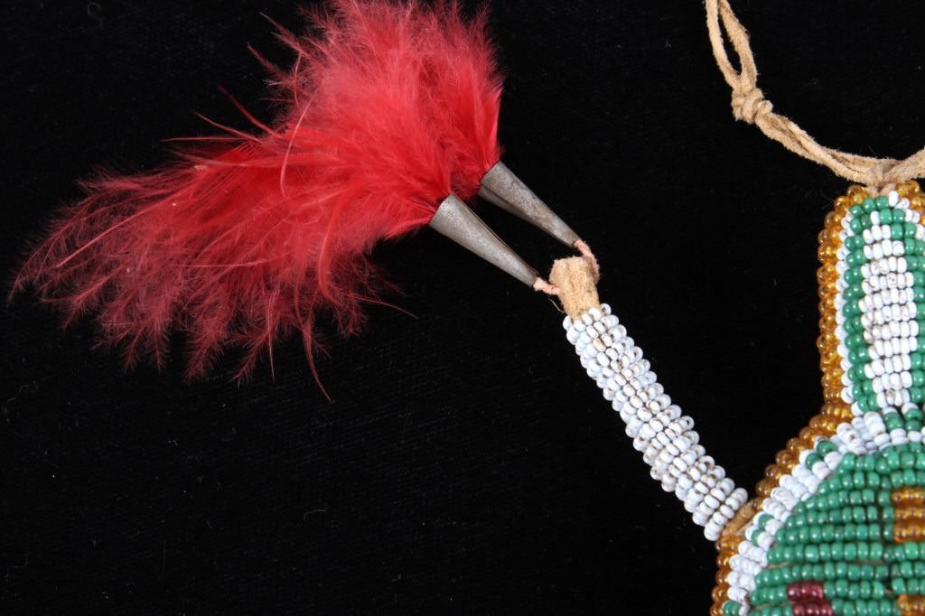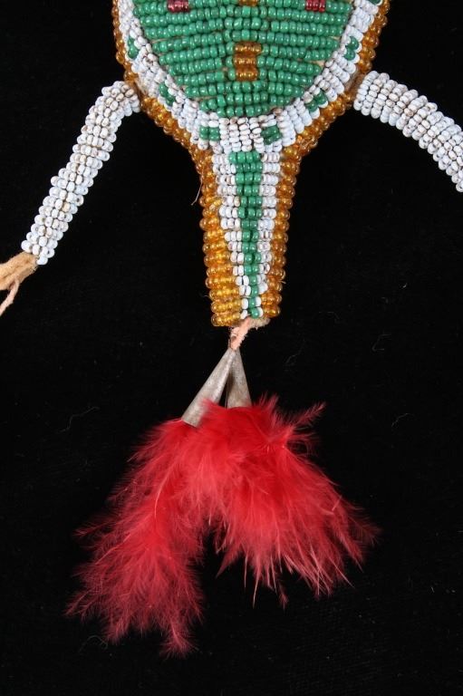 The lot features an early 1900 fully beaded turtle effigy umbilical cord fetish from the Sioux Native American Indians. The piece shows an Indian tanned hide construction that is completely covered in early glass trade seed beadwork in a geometric pattern with colors of greasy rose, amber, medium green and chalk white. The piece shows an oval stuffed shape with protruding head and triangular tail and rope beaded fringe for arms each showing two rolled tin jingle cones with red plume feathers. The top of the fetish shows an Indian tanned hide strap. These were said to be filled with the umbilical cord of the newly born and worn around their neck. Provenance: From a historic Eastern Montana American Indian Collection, where the piece was found to be an authentic original, one of the finest collections of American Indian weaponry and antiquities in Montana. Both are approximately 5”L with the fringe and strap being 14”L by 5”W without feathers.