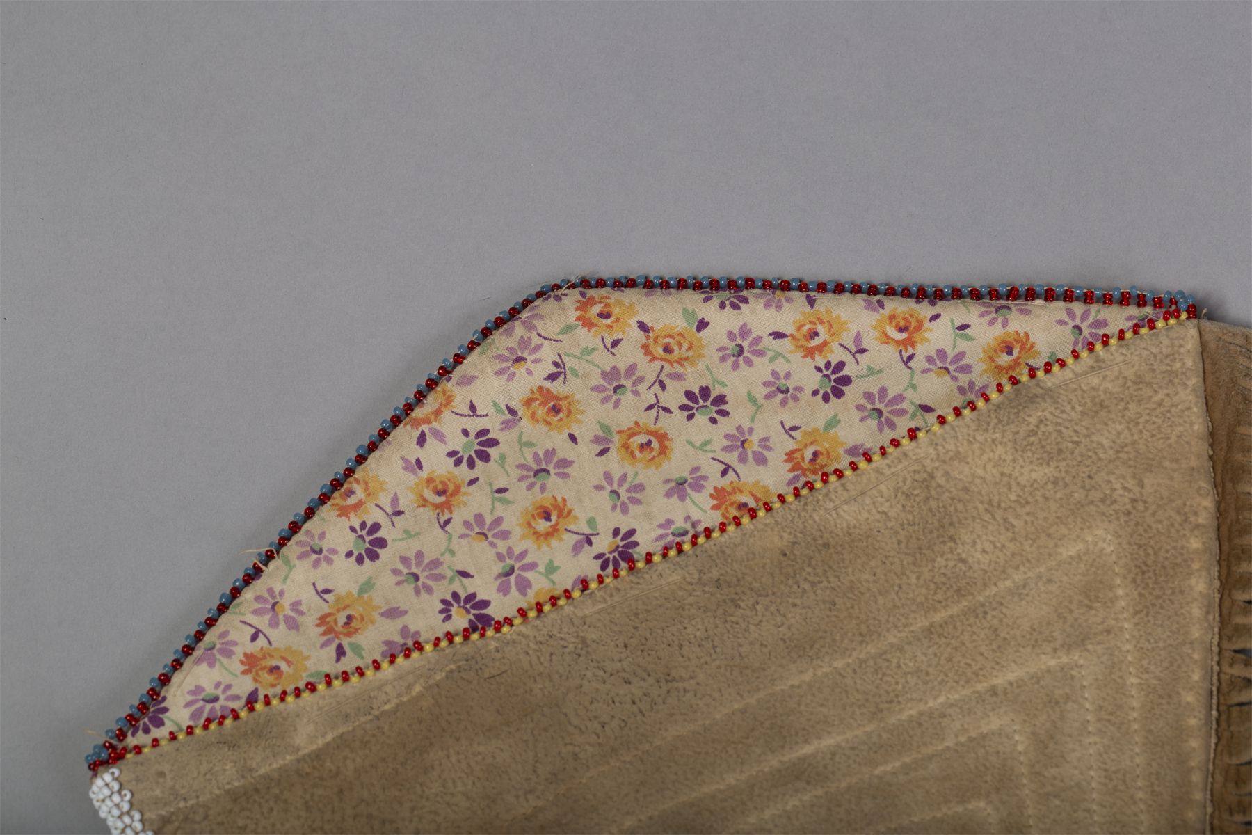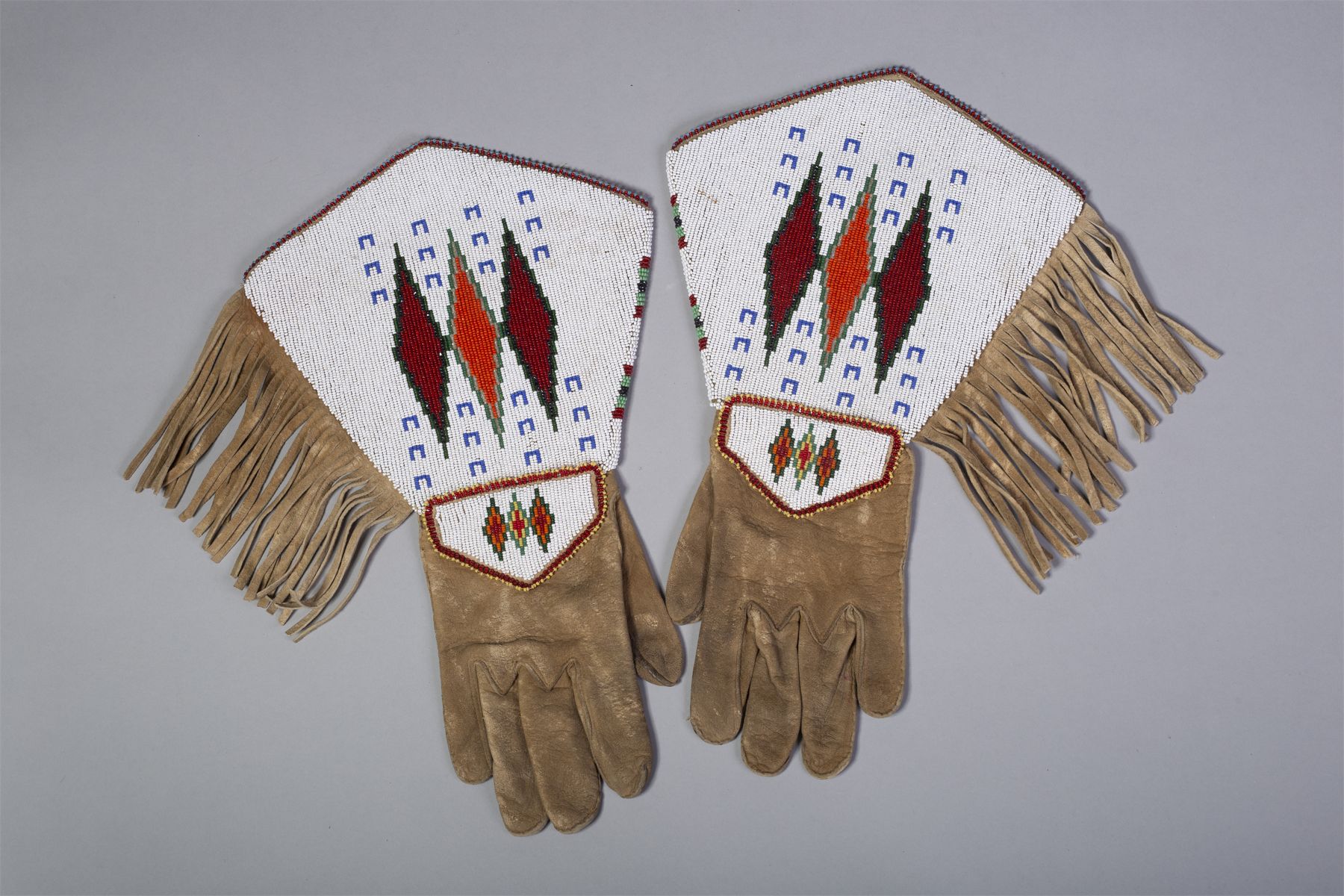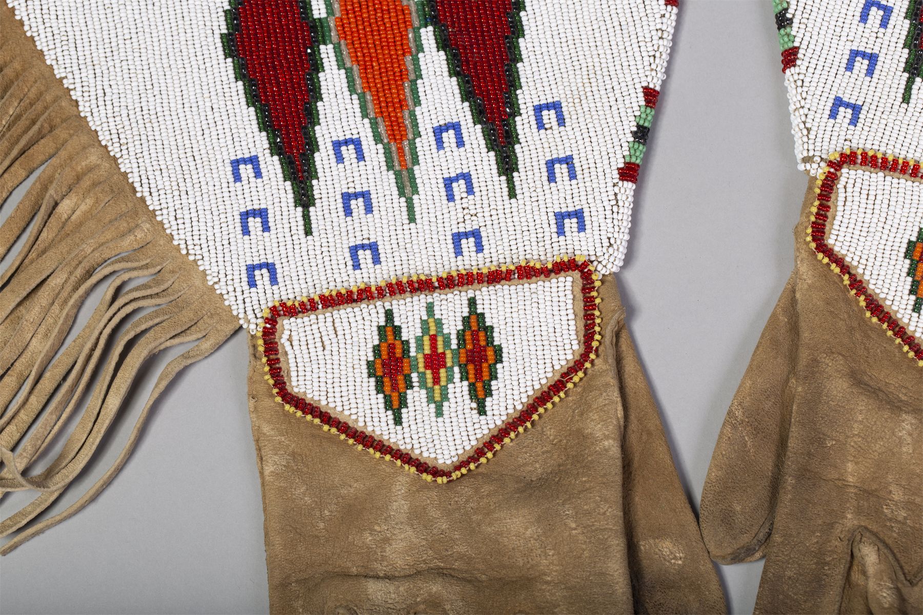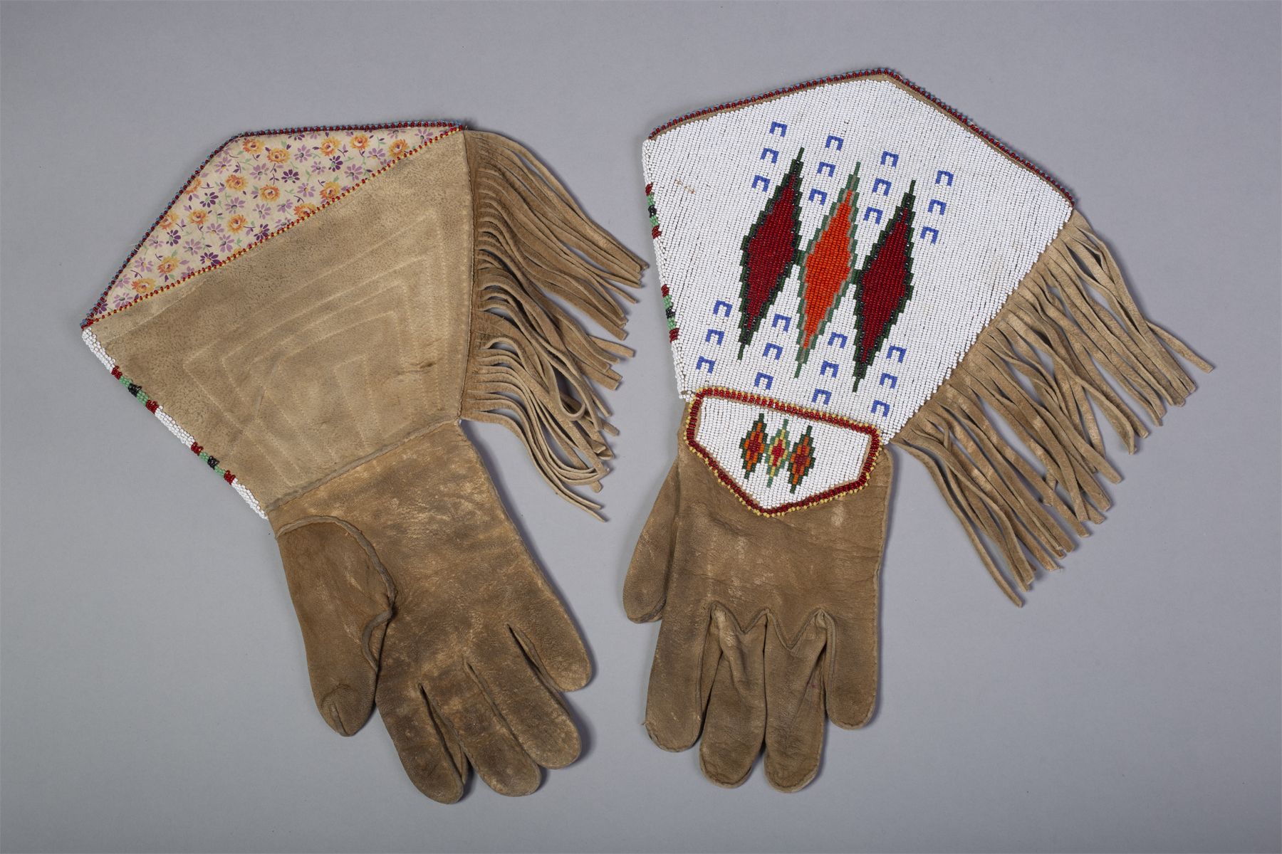 Sioux Gauntlets with blue pony tracks. White background with three diamonds on hand and forearm in green, red, orange and yellow beads. Floral trade cloth lined.