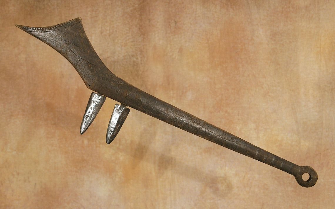 Sioux Gunstock War Club. 29" long with double forged spikes (4" & 3 ¾"). Early 1900s. (est. $4,000-6,000). CONDITION REPORTS: www.auctioninsantafe.com/docs/cr2012.pdf
