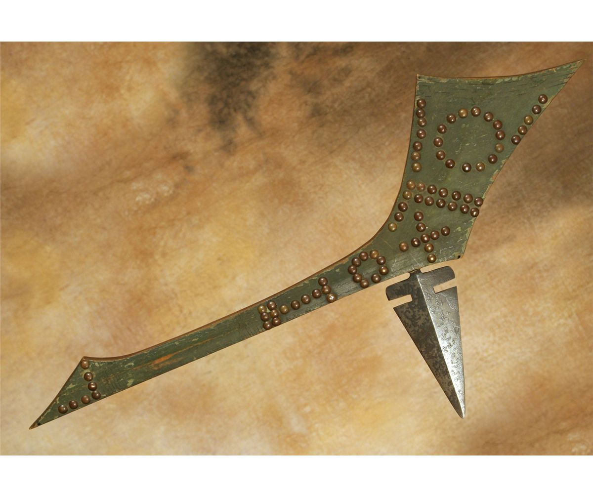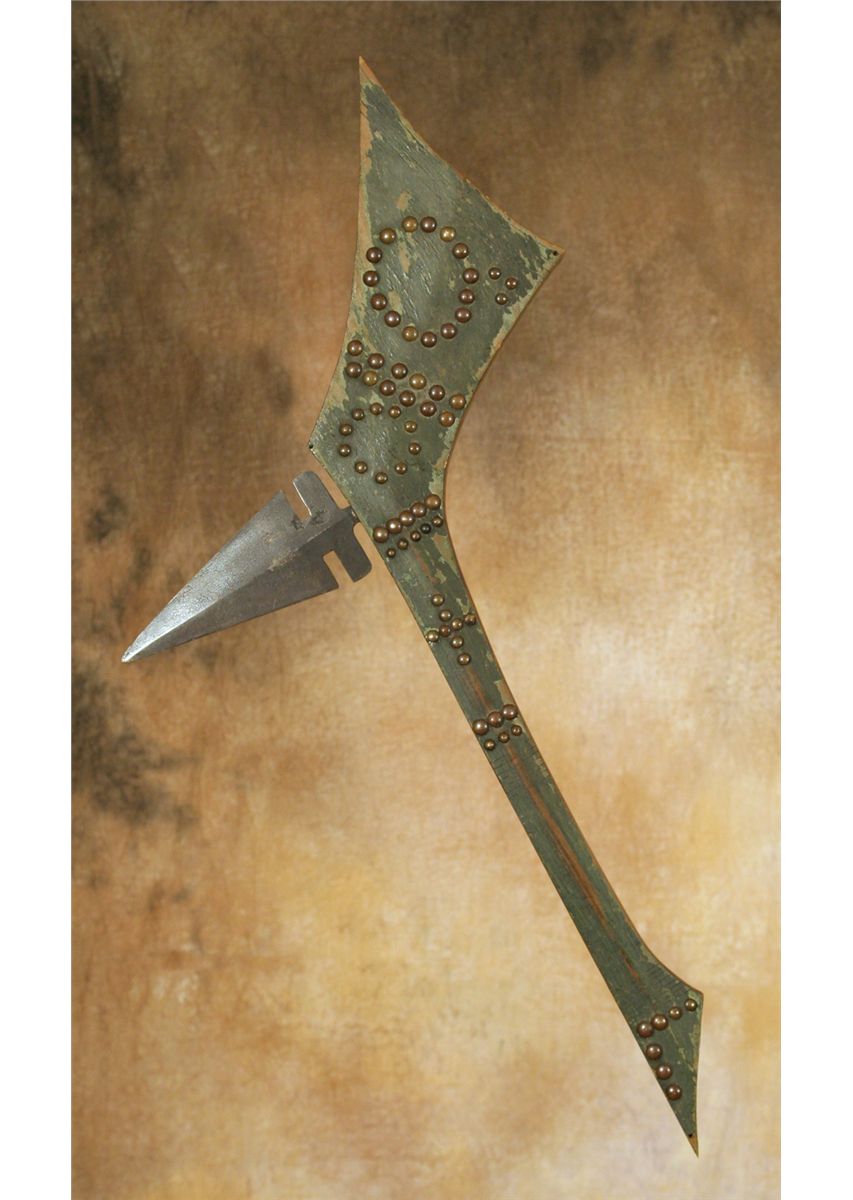 Sioux Gunstock War Club. 28" long. Heavy example from the Indian Wars period. Collected from the Sioux in South Dakota. 7" forged iron, notch-cut trade blade which is held in place with melted bullet lead. Nice, thick, heavy haft has old green paint, brass tack designs & incised lines. Circa 1870. This is a great piece showing good signs of proper age & use. Pictured in The Mark Francis Collection of American Indian Art (2009), page 134, figure 208.
