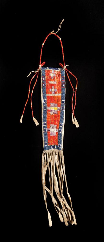 Beaded and quilled on hide with quill wrapped decoration and fringed base. 16” long with fringe, 2 1/2” wide at top, c. 1880s. Provenance: ex: Maryland Academy of Sciences, Baltimore (WC 9/05)
