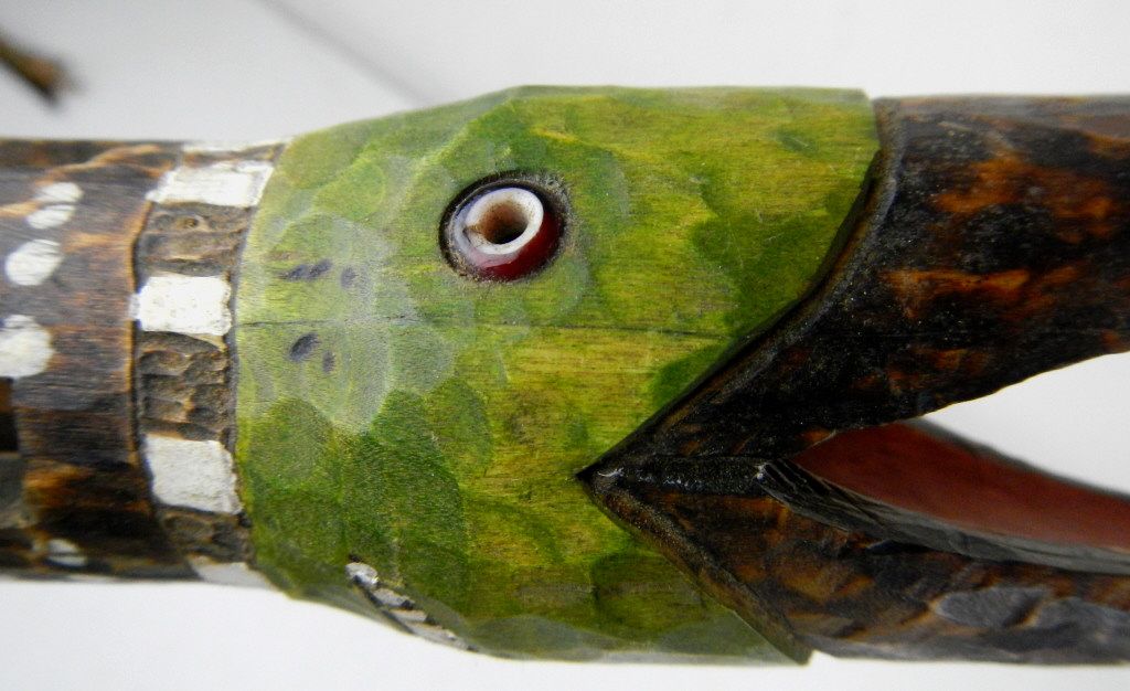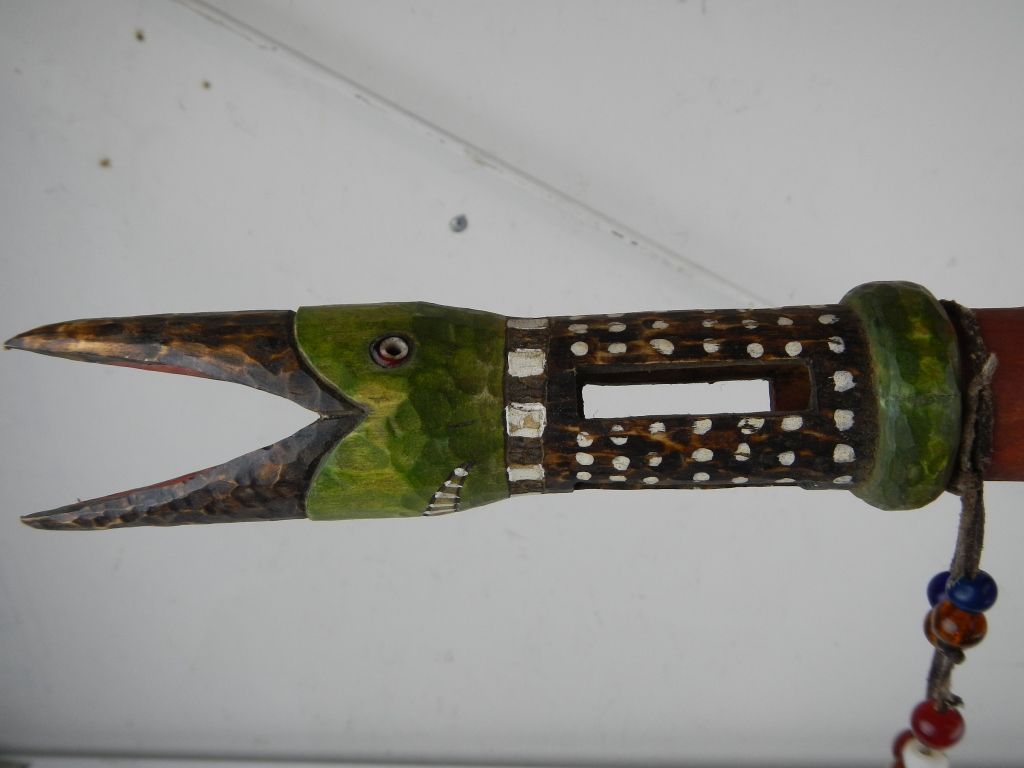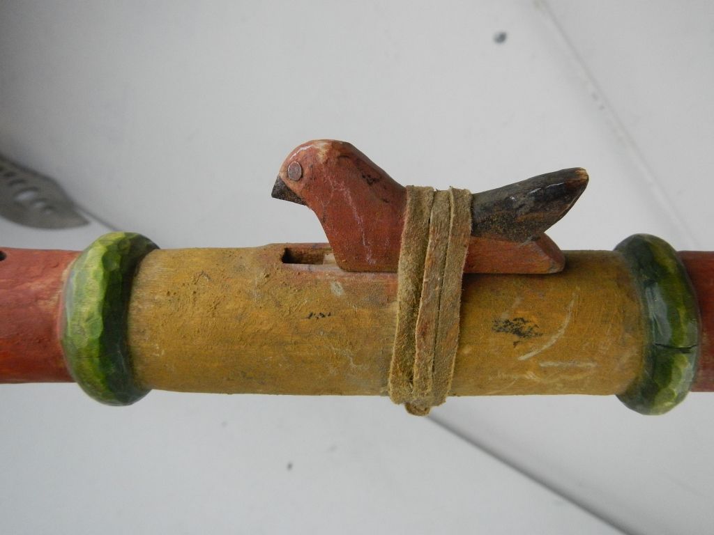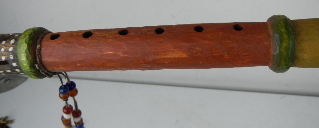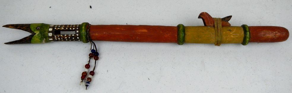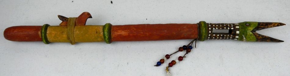 Sioux Hand Carved Flute - This piece is from teh Central South Dakota Sioux from teh Rose Bud Reservation in a town called Porcupine and was made by, "Four Winds." This is a beautiful work of art Carving featuring the head of a loon. This flute has wonderful sound and is in great condition including the bird on top and 1800's glass trade beads. This piece is from the 1940-1960's and measures 23.5" long.