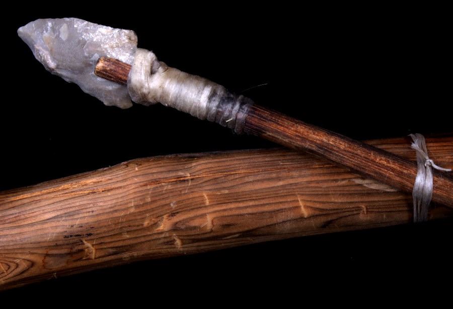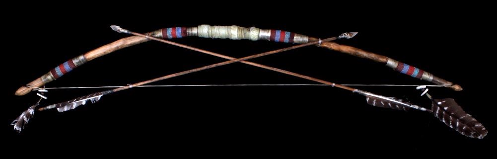 For your bidding pleasure is this Native American Bow and Arrows. This bow is Native American hand crafted and presents intricate beadwork in four places, two above and below the animal hide grip. The beadwork shows two six layered bands of maroon beads outside of five layer bands of turquoise, red, and light blue bead bands. The bow is finished with sinew strands of twine and sinew bowstring. The two arrows are fastened to the bowstring and bow with sinew twine. At either end of the bow are circular bone tassels with feather tipped ends. The measurements of the bow are 45" x 9".