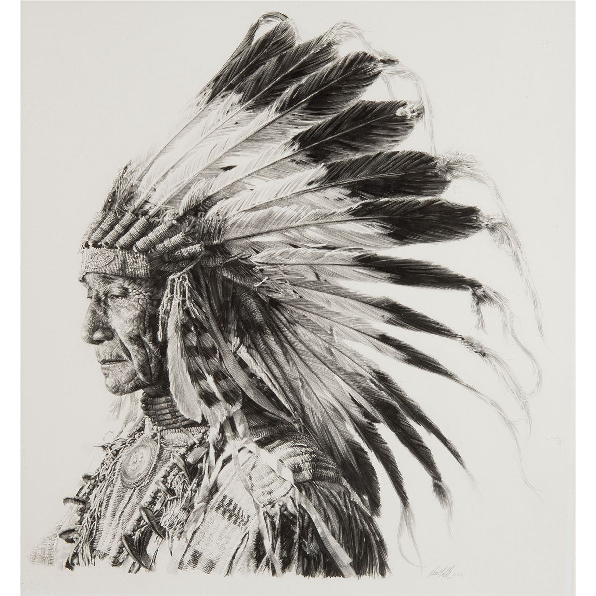 Sioux Chief is a magnificent pencil drawing by one of the master practitioners of the mediumÑ Paul Calle. You feel the feathers in the headdress unfurling as the chiefÕs eyes drop. The top feathers rise with preening pride while the feathers at bottom bow and dip. It is a metaphor for life, the kind of life the old chief has led: he is proud is his achievements and the honor he has upheld, yet he must bow before time, that passes and makes old men of us all. All this, with nothing more than a pencil.