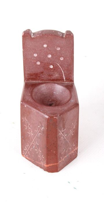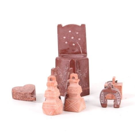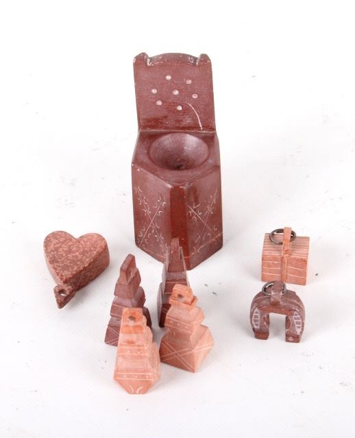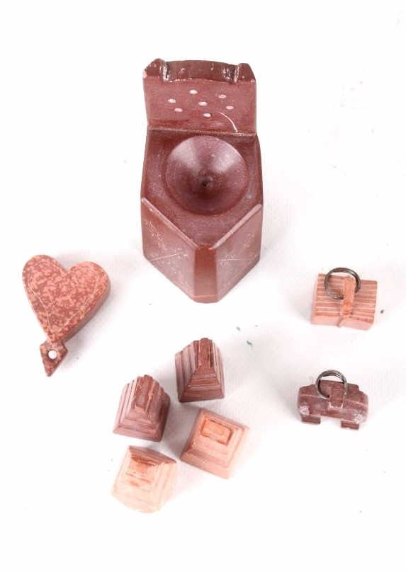 Featured in this lot is a Sioux Indian Pipestone (catlinite) Effigy Collection, c. 1950's-60's. Eight objects in total, this collection features sculptures such as a horseshoe, heart, wash basin, and other sybolic pieces. Most of the pieces show tooling design with traditional symbols. Other than the basin sculpture, each piece measures no more than 1" in height. These pieces are in good condition.