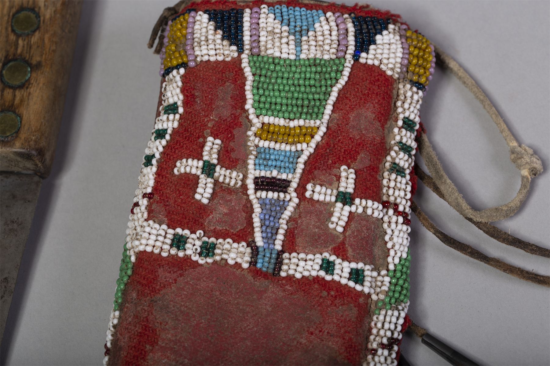 Sheath made of red trade cloth attached to thick hide and beaded with pink, yellow, white, navy, light blue, green and red beads. Beaded drop with cones and horsehair. Much of red trade cloth missing.