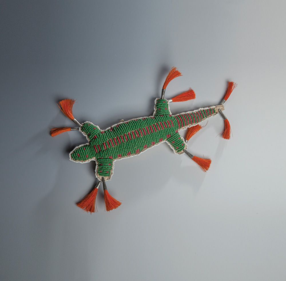 Sioux Lizard Fetish. The top side is covered in striped green and red white-heart beadwork, and framed with white beads. Legs and tail are decorated with dyed orange horsehair-stuffed tin cones. Circa 1910-1920, 10" x 3".